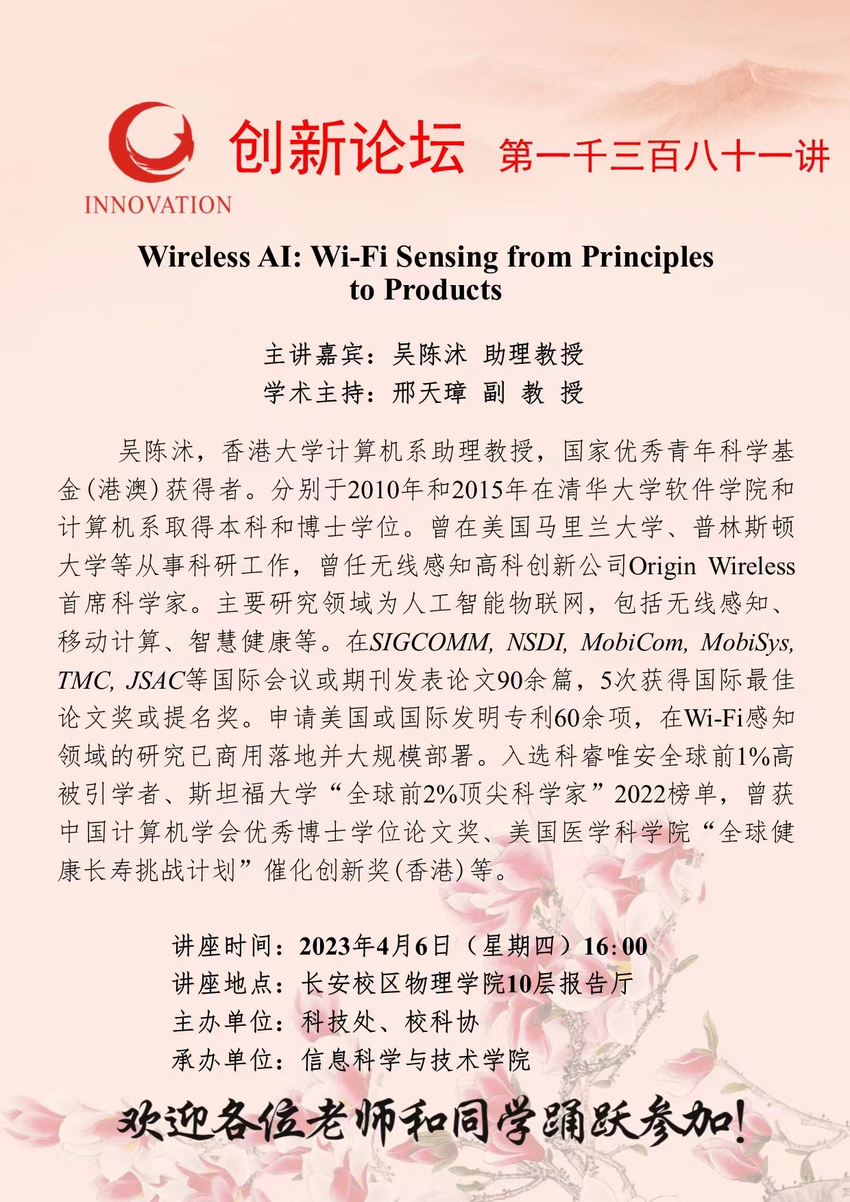 吴陈沭 助理教授 伟德国际1949始于英国创新论坛第一千三百八十一讲:Wireless AI: Wi-Fi Sensing from Principles to Products 讲座时间 2023年4月6日(星期四)16:00 讲座地点 长安校区物理学院10层报告厅 讲座人介绍 吴陈沭 助理教授 讲座内容