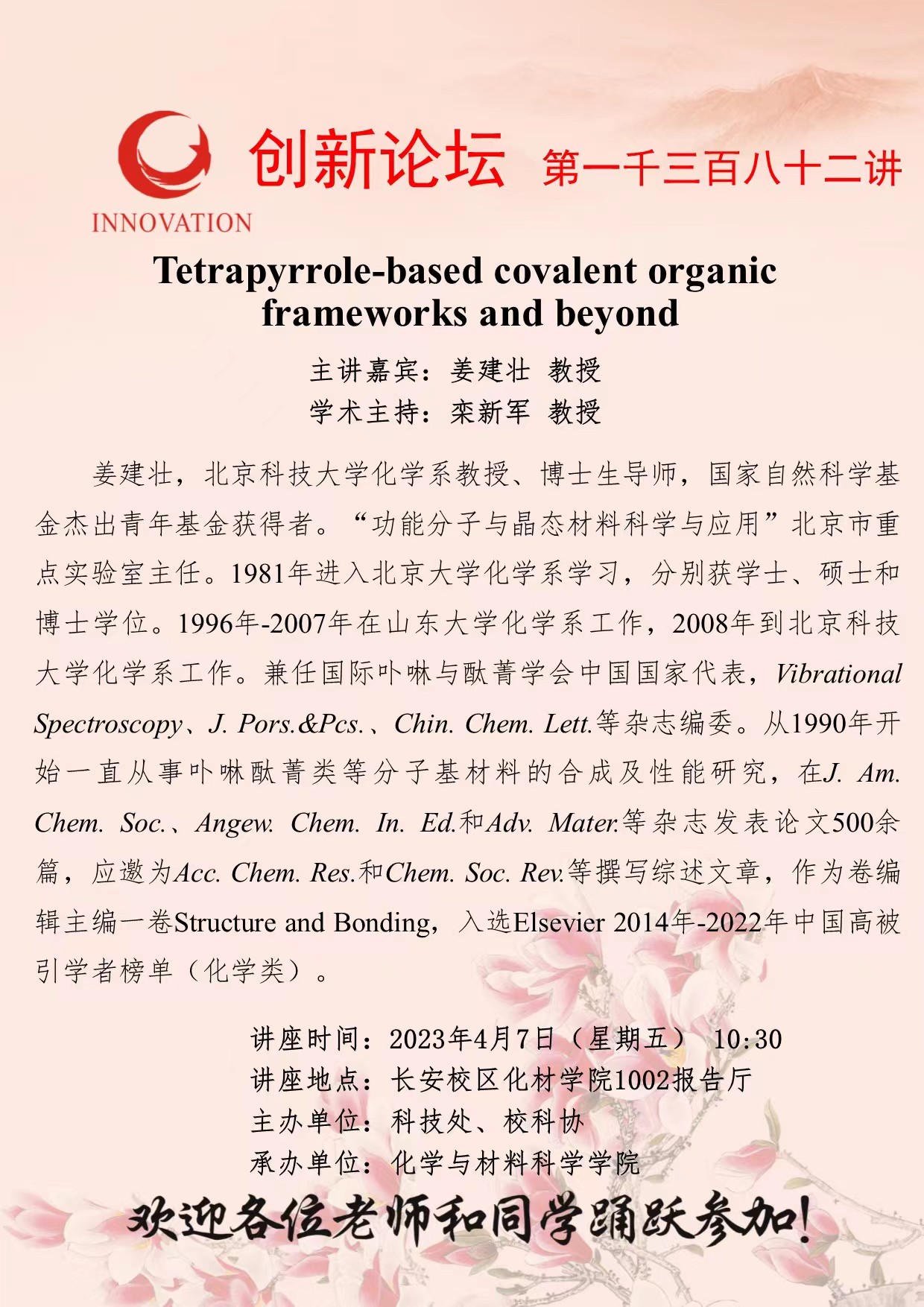 姜建壮 教 授 伟德国际1949始于英国创新论坛第一千三百八十二讲:Tetrapyrrole-based covalent organic frameworks and beyond 讲座时间 2023年4月7日(星期五) 10:30 讲座地点 长安校区化材学院1002报告厅 讲座人介绍 姜建壮 教 授 讲座内容
