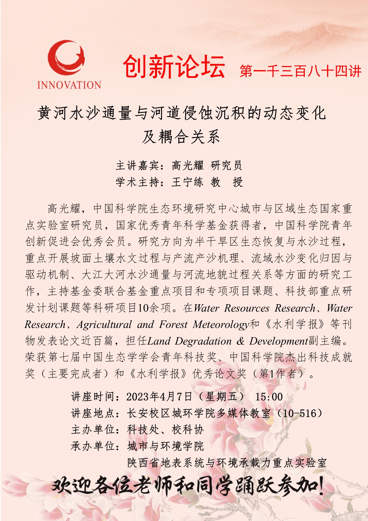 高光耀 研究员 伟德国际1949始于英国创新论坛第一千三百八十四讲:黄河水沙通量与河道侵蚀沉积的动态变化及耦合关系 讲座时间 2023年4月7日(星期五) 15:00 讲座地点 长安校区城环学院多媒体教室(10-516) 讲座人介绍 高光耀 研究员 讲座内容