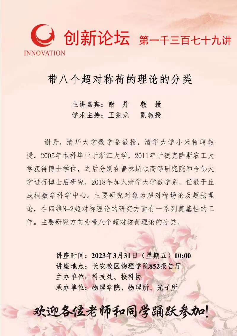 谢丹 教授 伟德国际1949始于英国创新论坛第一千三百七十九讲:带八个超对称荷的理论的分类 讲座时间 2023年3月31日(星期五)10:00 讲座地点 长安校区物理学院852报告厅 讲座人介绍 谢丹 教授 讲座内容
