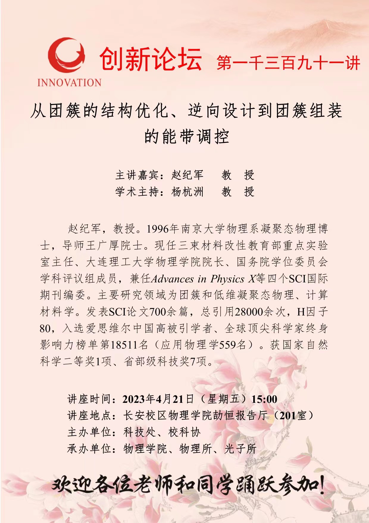 赵纪军 教 授 伟德国际1949始于英国创新论坛第一千三百九十一讲:从团簇的结构优化、逆向设计到团簇组装的能带调控 讲座时间 2023年4月21日(星期五)15:00 讲座地点 长安校区物理学院劼恒报告厅(201室) 讲座人介绍 赵纪军 教 授 讲座内容
