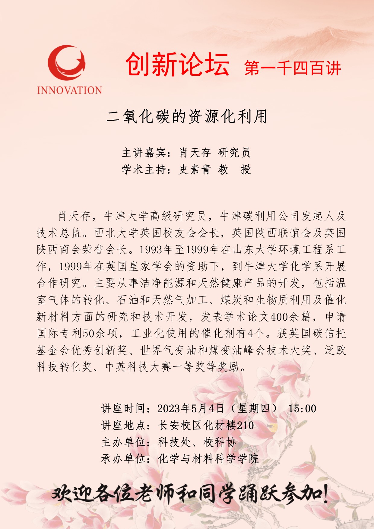 肖天存 研究员 伟德国际1949始于英国创新论坛第一千四百讲:二氧化碳的资源化利用 讲座时间 2023年5月4日(星期四) 15:00 讲座地点 长安校区化材楼210 讲座人介绍 肖天存 研究员 讲座内容