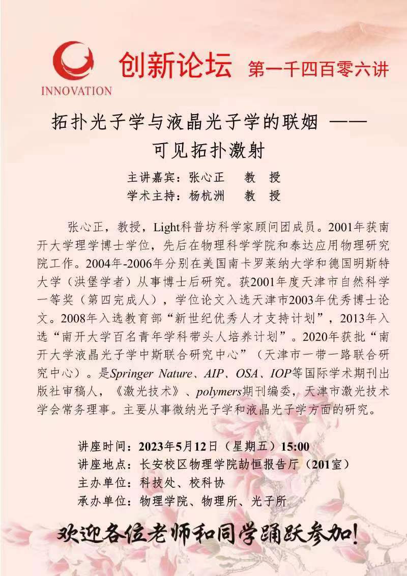 张心正 教 授 伟德国际1949始于英国创新论坛第一千四百零六讲:拓扑光子学与液晶光子学的联姻 — 可见拓扑激射 讲座时间 2023年5月12日(星期五)15:00 讲座地点 长安校区物理学院劼恒报告厅(201室) 讲座人介绍 张心正 教 授 讲座内容