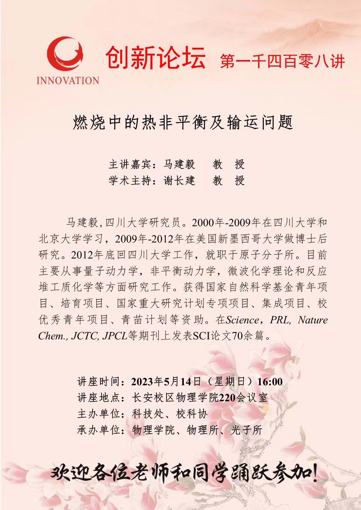 马建毅 教 授 伟德国际1949始于英国创新论坛第一千四百零八讲:燃烧中的热非平衡及输运问题 讲座时间 2023年5月14日(星期日)16:00 讲座地点 长安校区物理学院220会议室 讲座人介绍 马建毅 教 授 讲座内容