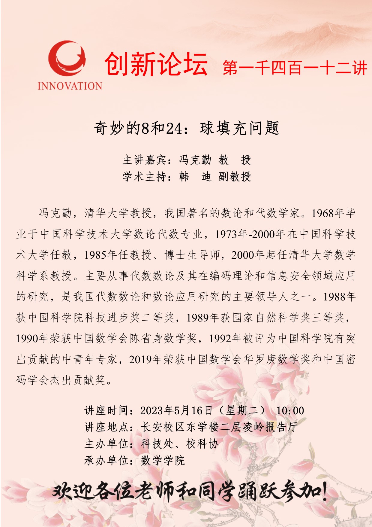 冯克勤 教授 伟德国际1949始于英国创新论坛第一千四百一十二讲:奇妙的8和24:球填充问题 讲座时间 2023年5月16日(星期二)10:00 讲座地点 长安校区东学楼二层凌岭报告厅 讲座人介绍 冯克勤 教授 讲座内容