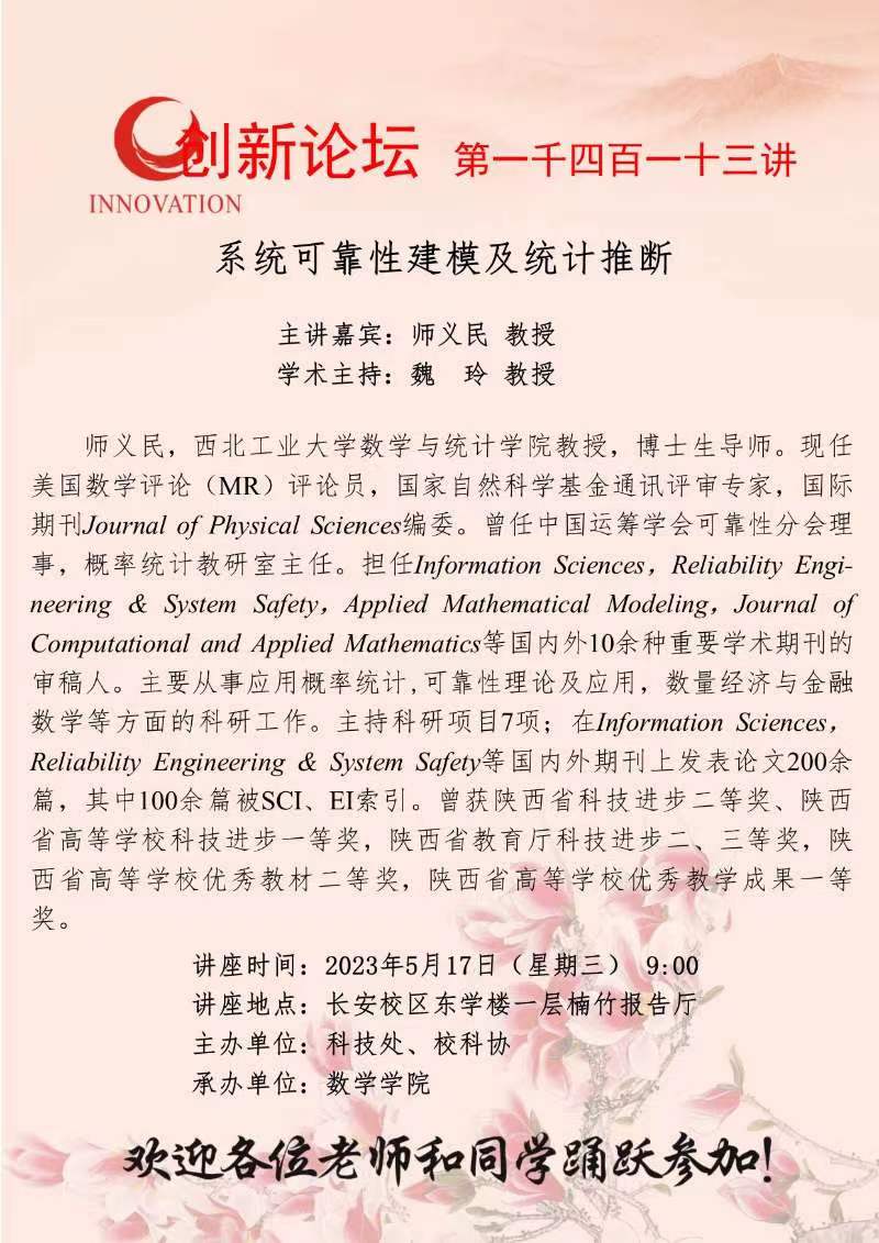 师义民 教授 伟德国际1949始于英国创新论坛第一千四百一十三讲:系统可靠性建模及统计推断 讲座时间 2023年5月17日(星期三) 9:00 讲座地点 长安校区东学楼一层楠竹报告厅 讲座人介绍 师义民 教授 讲座内容