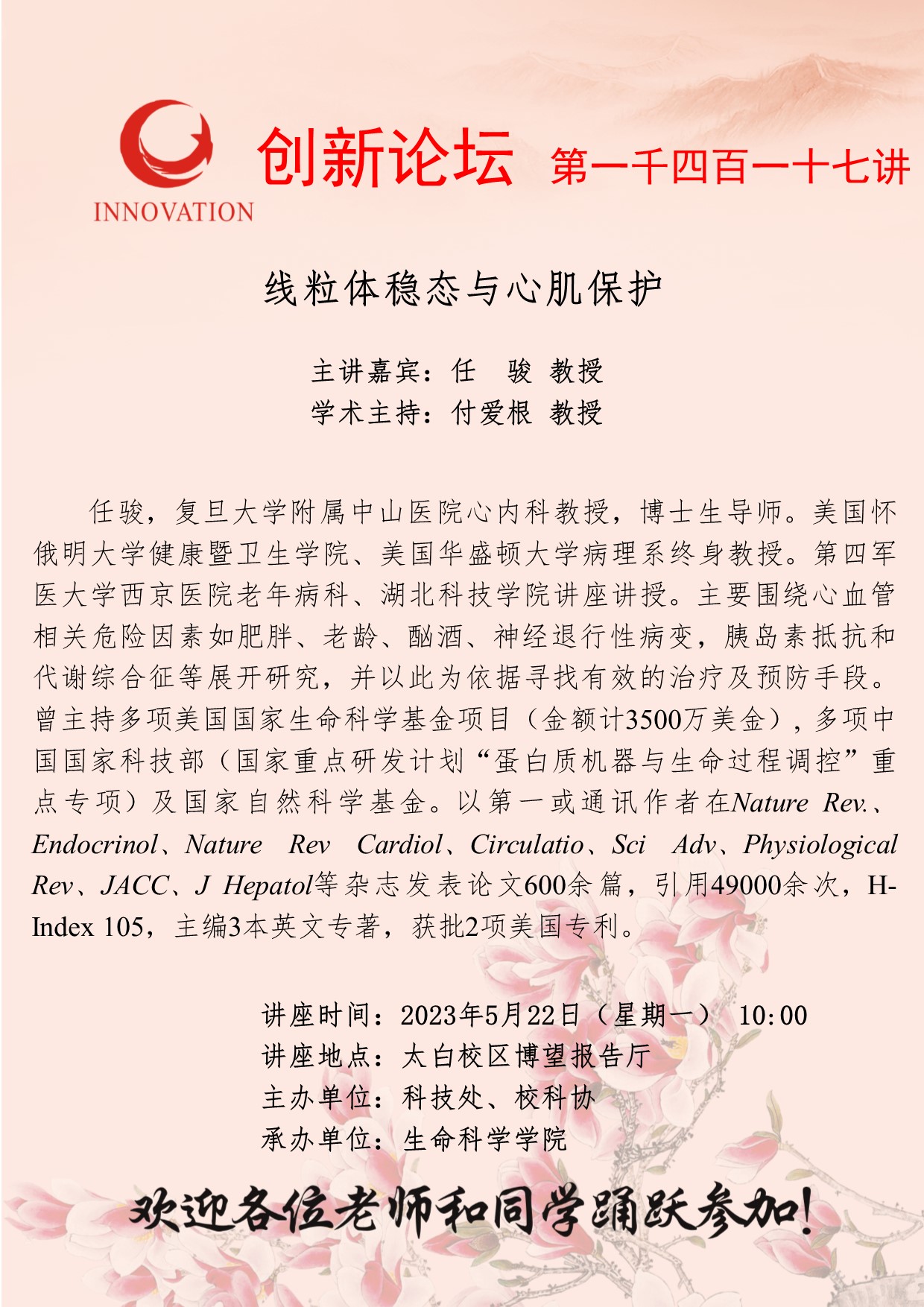 任骏 教授 伟德国际1949始于英国创新论坛第一千四百一十七讲:线粒体稳态与心肌保护 讲座时间 2023年5月22日(星期一) 10:00 讲座地点 太白校区博望报告厅 讲座人介绍 任骏 教授 讲座内容