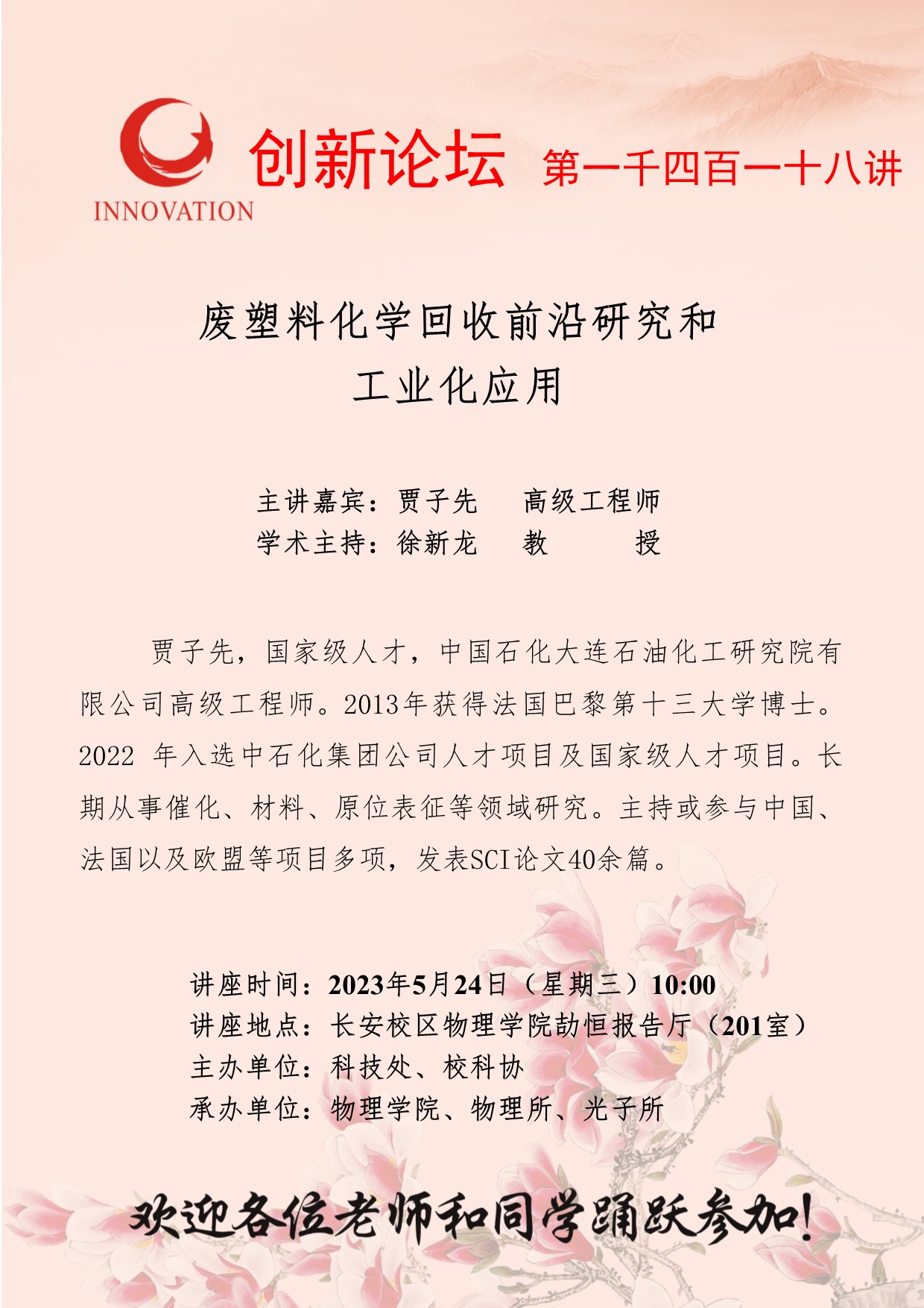 贾子先 高级工程师 伟德国际1949始于英国创新论坛第一千四百一十八讲:废塑料化学回收前沿研究和工业化应用 讲座时间 2023年5月24日(星期三)10:00 讲座地点 长安校区物理学院劼恒报告厅(201室) 讲座人介绍 贾子先 高级工程师 讲座内容