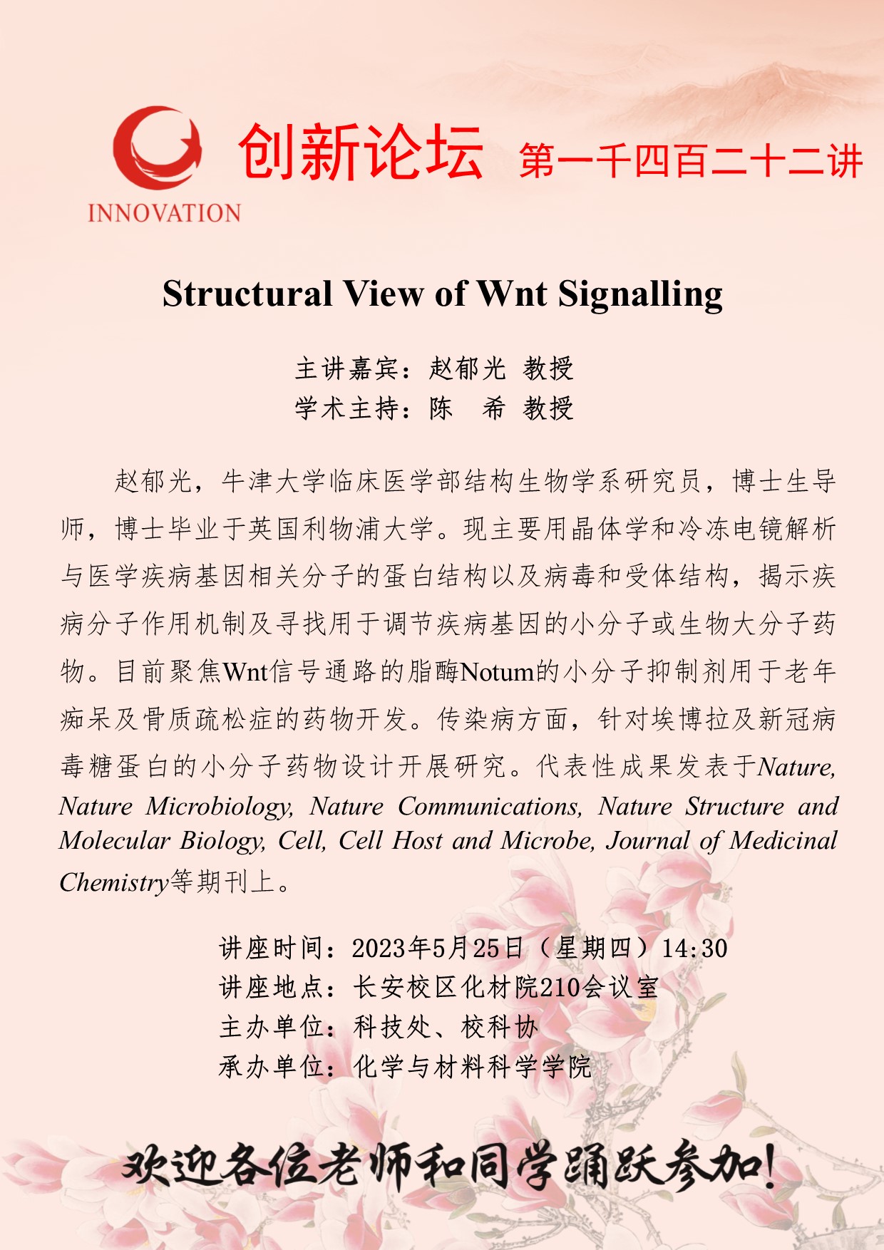 赵郁光 教授 伟德国际1949始于英国创新论坛第一千四百二十二讲:Structural View of Wnt Signalling 讲座时间 2023年5月25日(星期四)14:30 讲座地点 长安校区化材院210会议室 讲座人介绍 赵郁光 教授 讲座内容