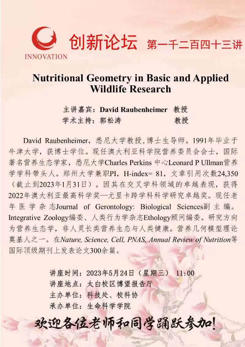 David Raubenheimer 教授 伟德国际1949始于英国创新论坛第一千四百二十四讲:Nutritional Geometry in Basic and Applied Wildlife Research 讲座时间 2023年5月24日(星期三)11:00 讲座地点 太白校区博望报告厅 讲座人介绍 David Raubenheimer 教授 讲座内容