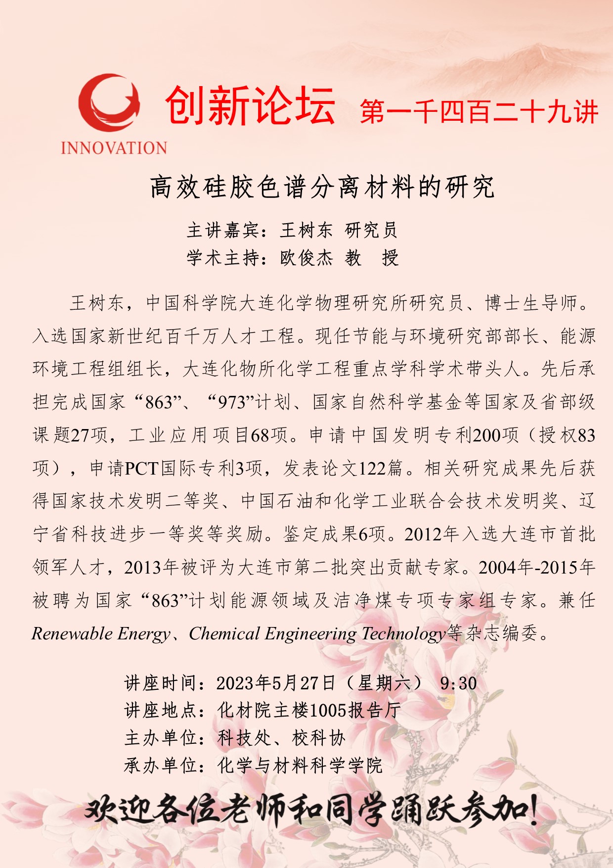 王树东 研究员 伟德国际1949始于英国创新论坛第一千四百二十九讲:高效硅胶色谱分离材料的研究 讲座时间 2023年5月27日(星期六) 9:30 讲座地点 化材院主楼1005报告厅 讲座人介绍 王树东 研究员 讲座内容