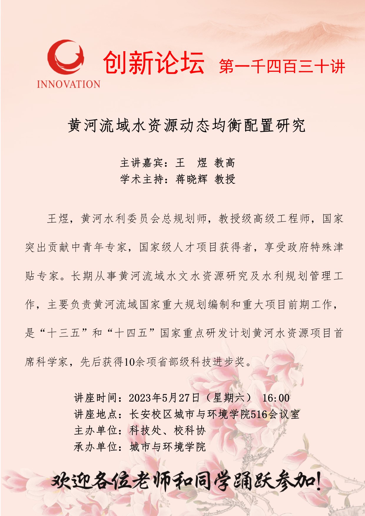 王 煜 教高 伟德国际1949始于英国创新论坛第一千四百三十讲:黄河流域水资源动态均衡配置研究 讲座时间 2023年5月27日(星期六) 16:00 讲座地点 长安校区城市与环境学院516会议室 讲座人介绍 王 煜 教高 讲座内容