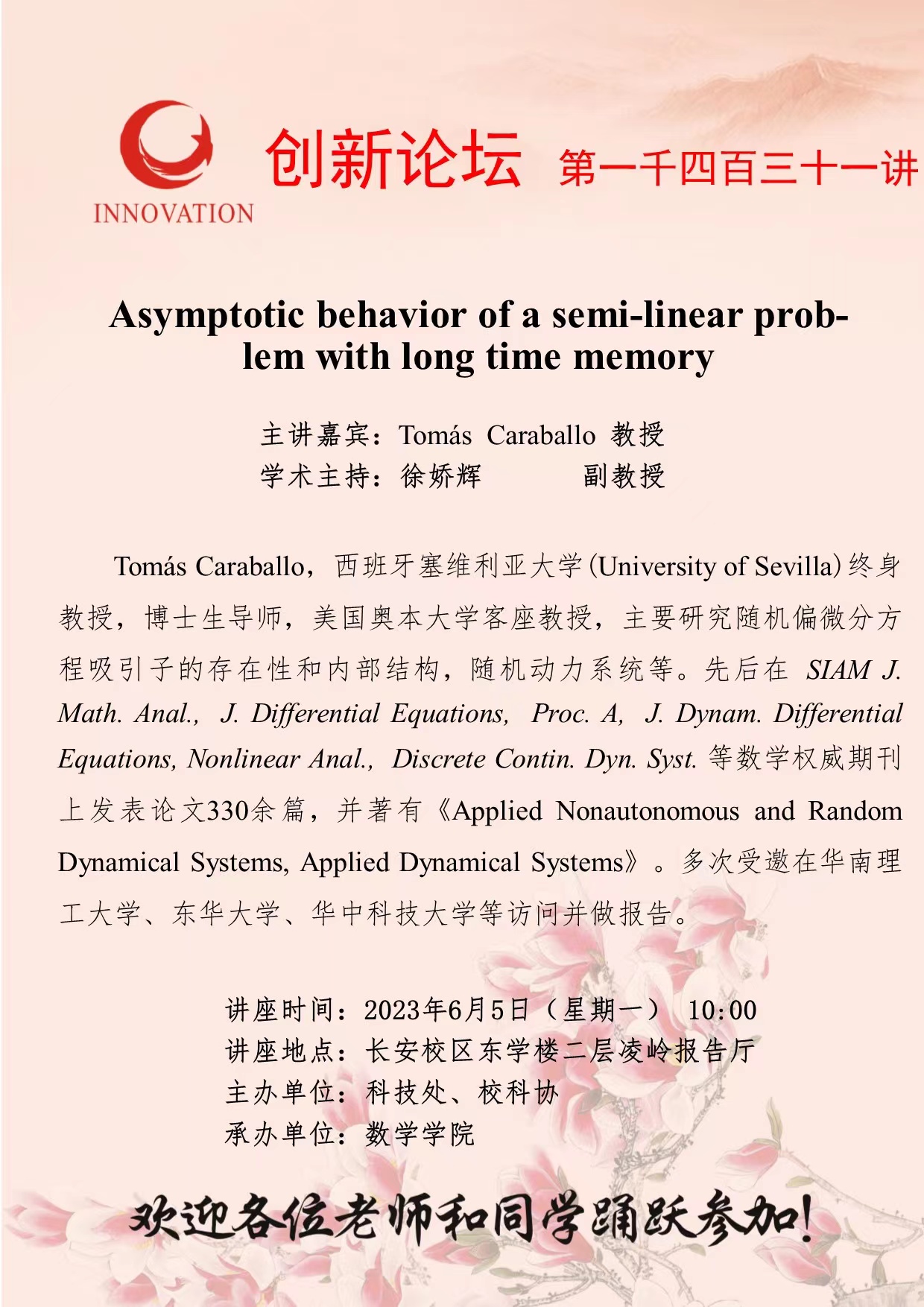 Tomás Caraballo 教授 伟德国际1949始于英国创新论坛第一千四百三十一讲:Asymptotic behavior of a semi-linear problem with long time memory 讲座时间 2023年6月5日(星期一) 10:00 讲座地点 长安校区东学楼二层凌岭报告厅 讲座人介绍 Tomás Caraballo 教授 讲座内容