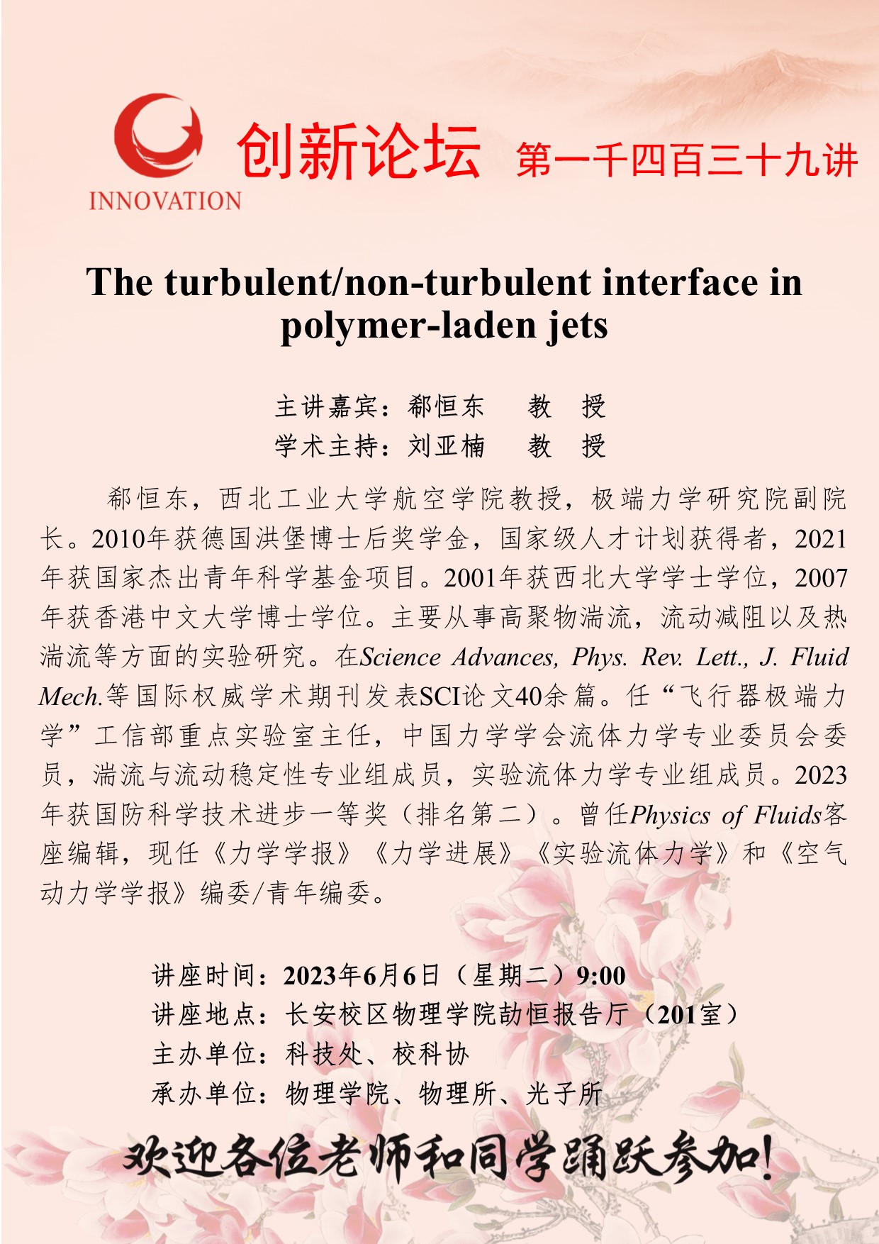 郗恒东 教授 伟德国际1949始于英国创新论坛第一千四百三十九讲:The turbulent/non-turbulent interface in polymer-laden jets 讲座时间 2023年6月6日(星期二)9:00 讲座地点 长安校区物理学院劼恒报告厅(201室) 讲座人介绍 郗恒东 教授 讲座内容