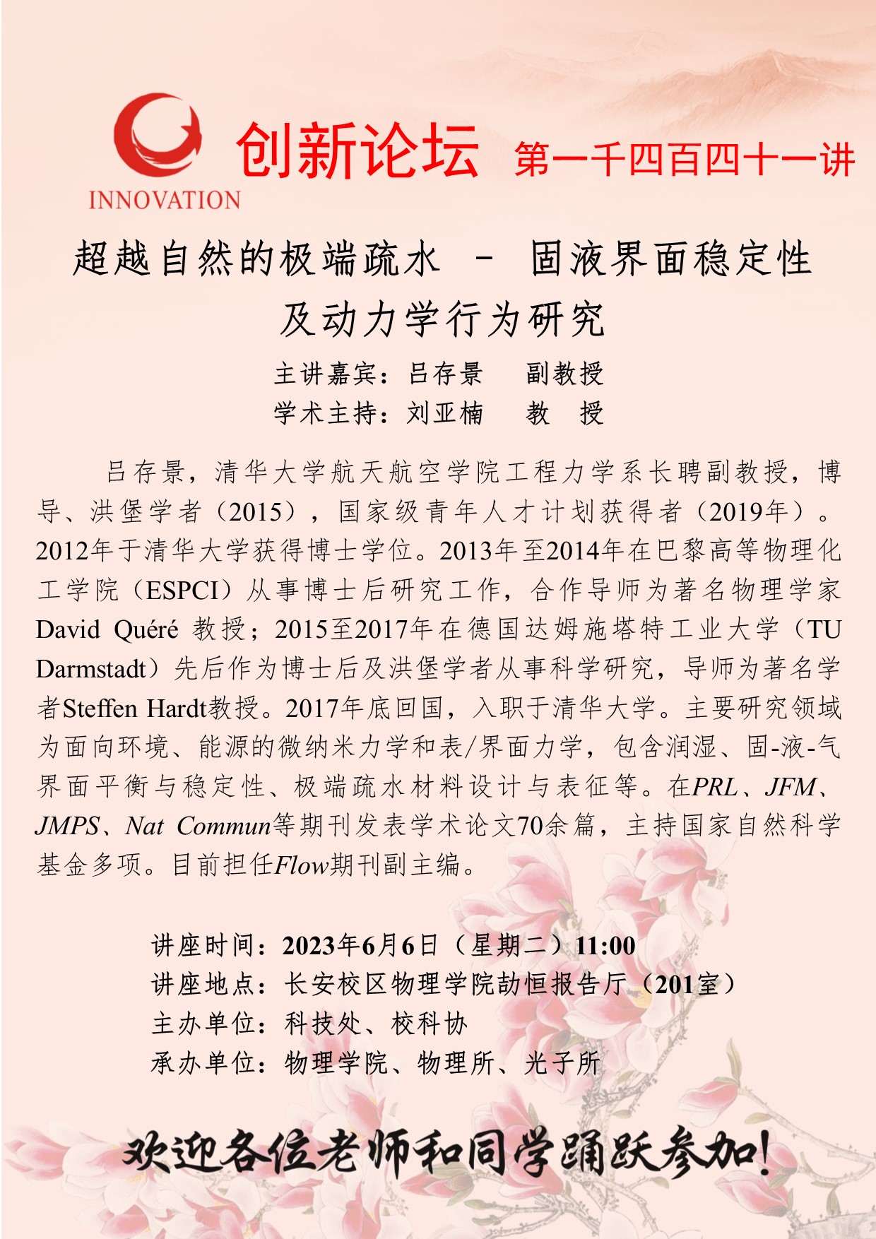 吕存景 副教授 伟德国际1949始于英国创新论坛第一千四百四十一讲:超越自然的极端疏水 – 固液界面稳定性及动力学行为研究 讲座时间 2023年6月6日(星期二)11:00 讲座地点 长安校区物理学院劼恒报告厅(201室) 讲座人介绍 吕存景 副教授 讲座内容