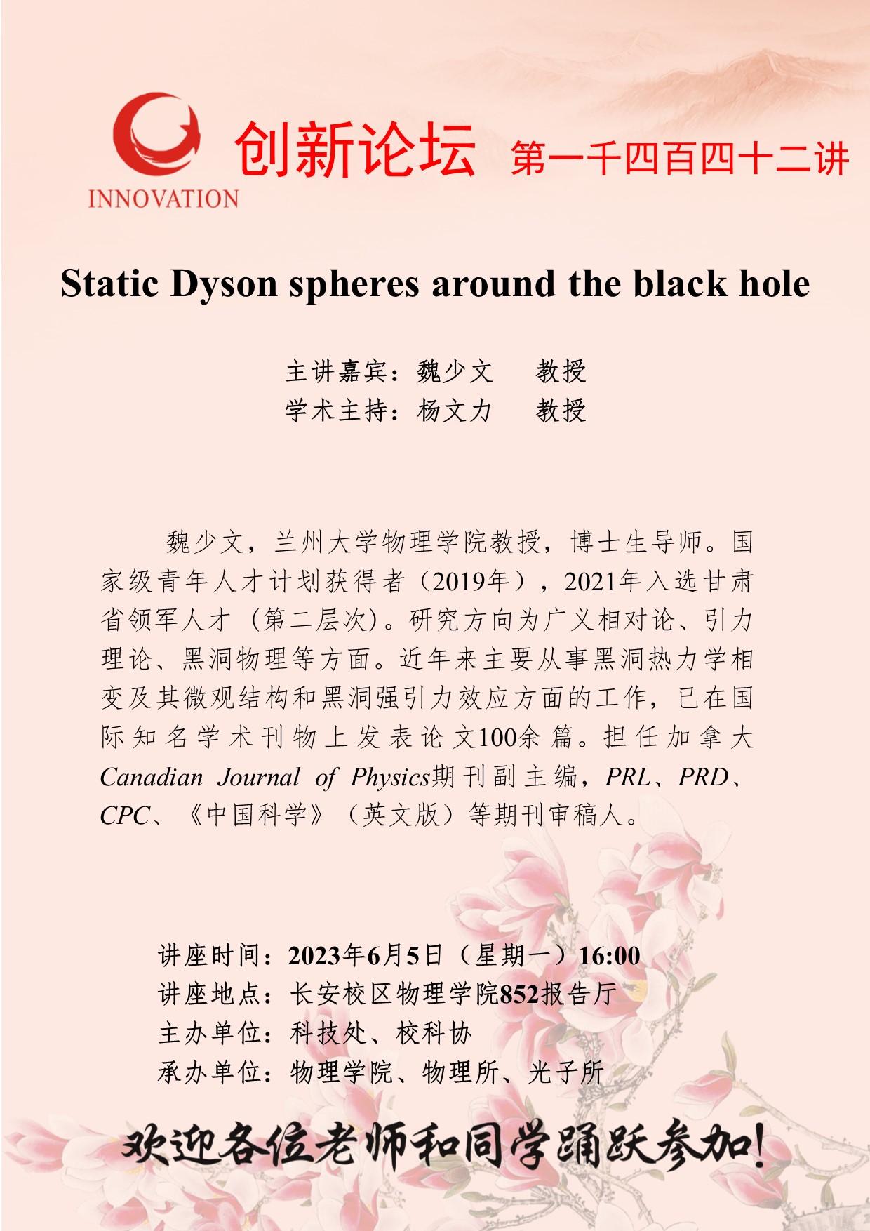 魏少文 教授 伟德国际1949始于英国创新论坛第一千四百四十二讲:Static Dyson spheres around the black hole 讲座时间 2023年6月5日(星期一)16:00 讲座地点 长安校区物理学院852报告厅 讲座人介绍 魏少文 教授 讲座内容