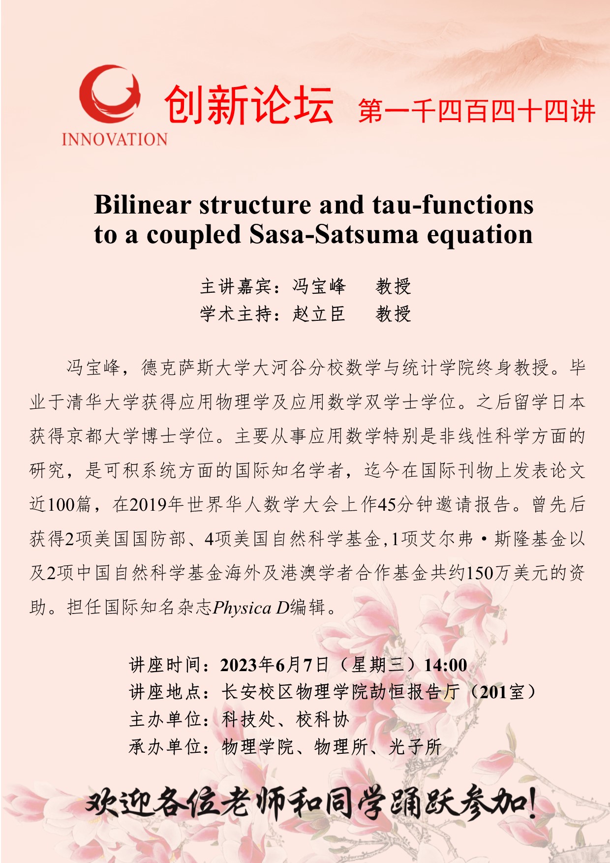 冯宝峰 教授 伟德国际1949始于英国创新论坛第一千四百四十四讲:Bilinear structure and tau-functions to a coupled Sasa-Satsuma equation 讲座时间 2023年6月7日(星期三)14:00 讲座地点 长安校区物理学院劼恒报告厅(201室) 讲座人介绍 冯宝峰 教授 讲座内容