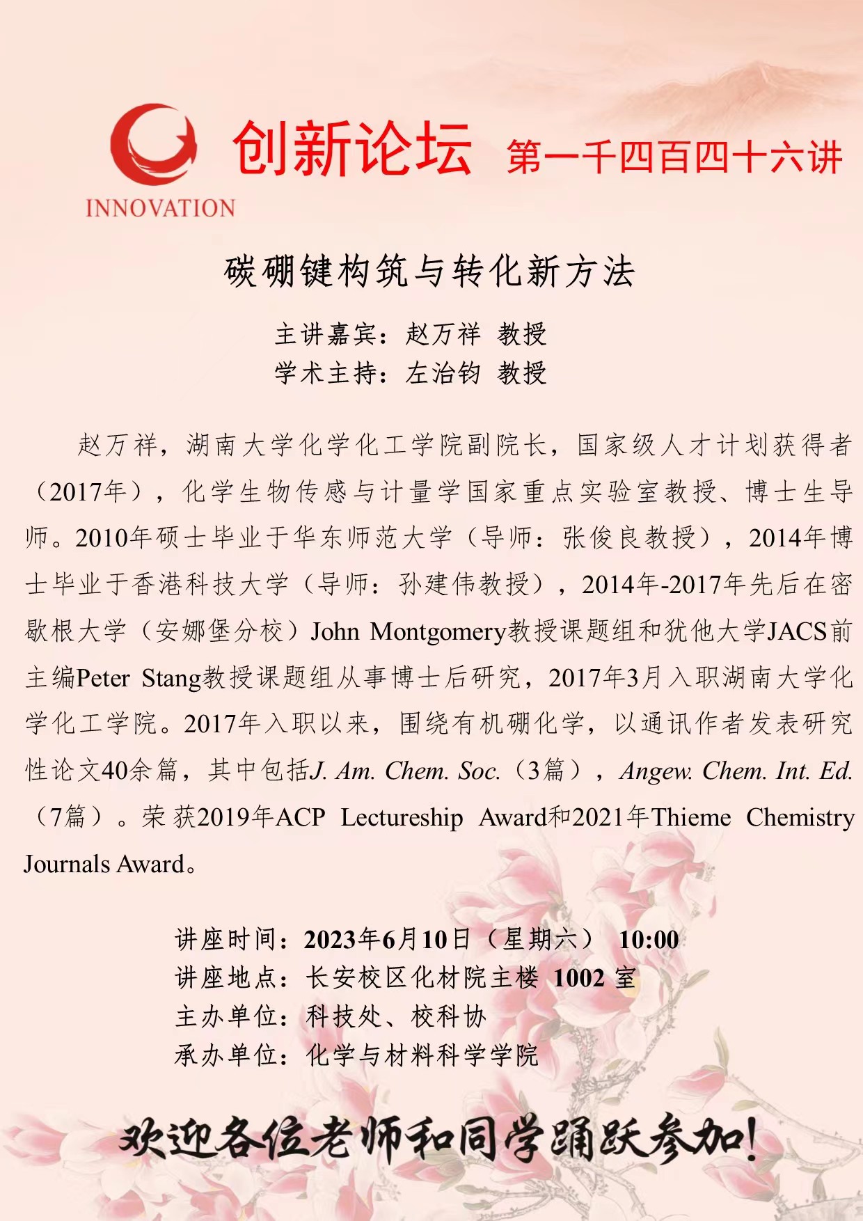 赵万祥 教授 伟德国际1949始于英国创新论坛第一千四百四十六讲:碳硼键构筑与转化新方法 讲座时间 2023年6月10日(星期六) 10:00 讲座地点 长安校区化材院主楼 1002 室 讲座人介绍 赵万祥 教授 讲座内容