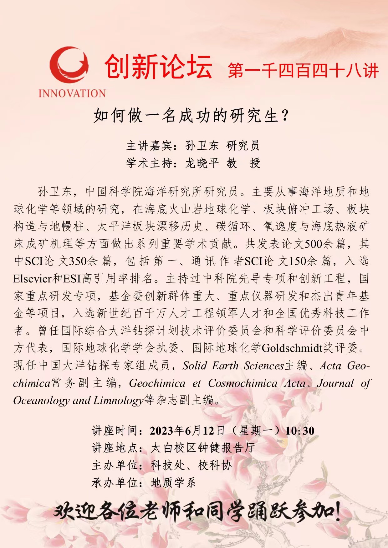 孙卫东 教 授 伟德国际1949始于英国创新论坛第一千四百四十八讲:如何做一名成功的研究生? 讲座时间 2023年6月12日(星期一)10:30 讲座地点 太白校区钟健报告厅 讲座人介绍 孙卫东 教 授 讲座内容