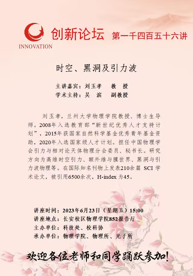 刘玉孝 教授 伟德国际1949始于英国创新论坛第一千四百五十六讲: 时空、黑洞及引力波 讲座时间 2023年6月23日(星期五)15:00 讲座地点 长安校区物理学院852报告厅 讲座人介绍 刘玉孝 教授 讲座内容