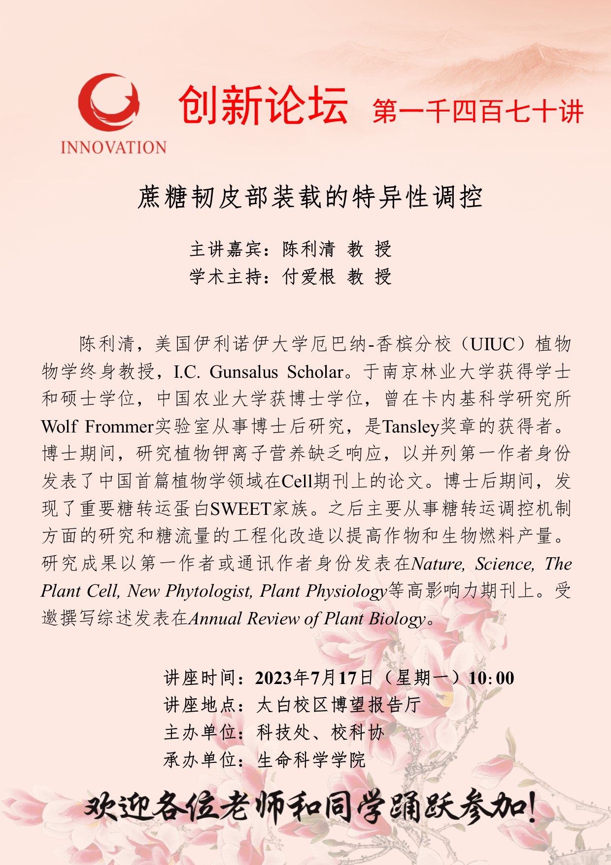 陈利清 教授 伟德国际1949始于英国创新论坛第一千四百七十讲:蔗糖韧皮部装载的特异性调控 讲座时间 2023年7月17日(星期一)10:00 讲座地点 太白校区博望报告厅 讲座人介绍 陈利清 教授 讲座内容
