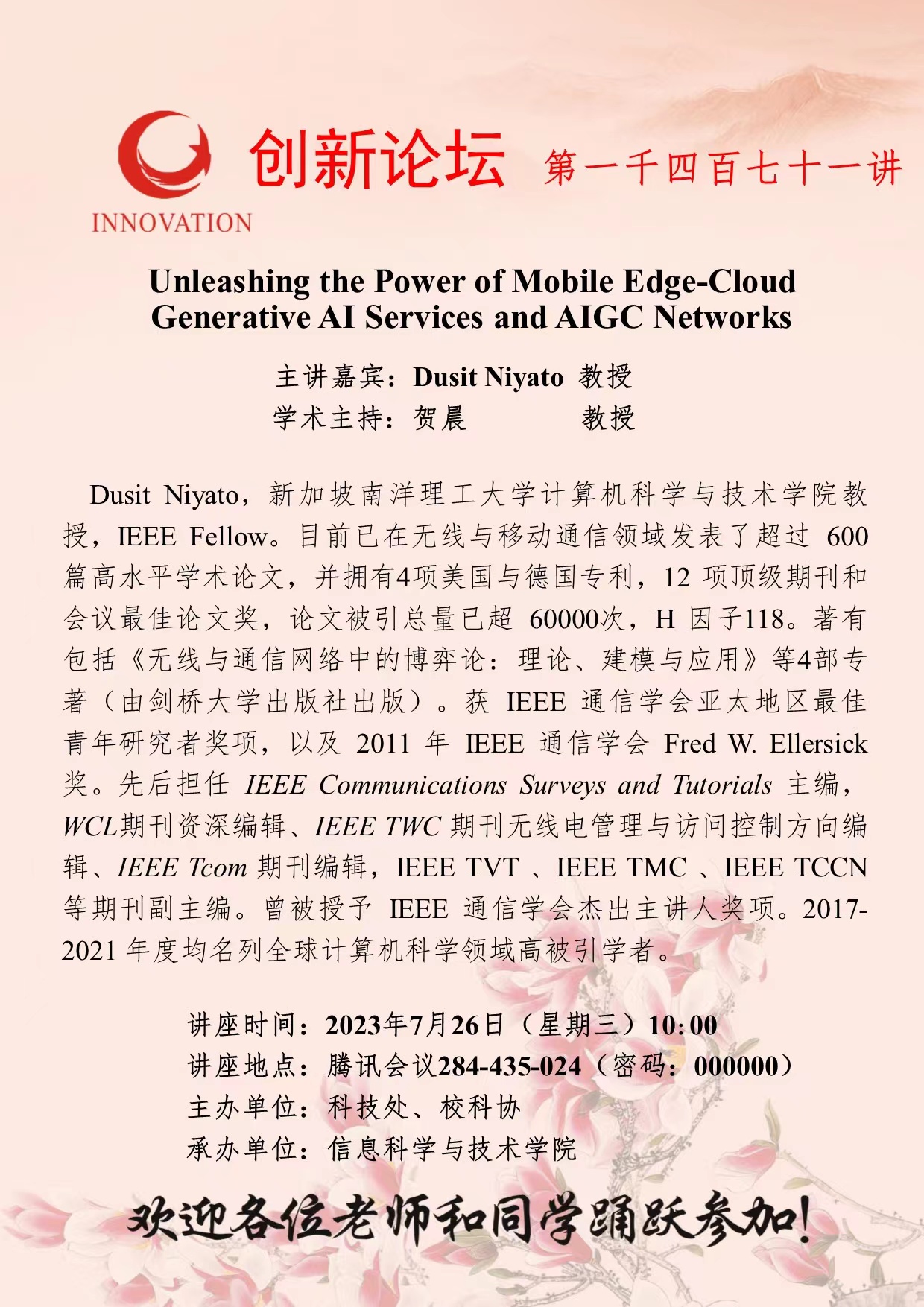 Dusit Niyato 教授 伟德国际1949始于英国创新论坛第一千四百七十一讲:Unleashing the Power of Mobile Edge-Cloud Generative AI Services and AIGC Networks 讲座时间 2023年7月26日(星期三)10:00 讲座地点 腾讯会议284-435-024(密码:000000) 讲座人介绍 Dusit Niyato 教授 讲座内容