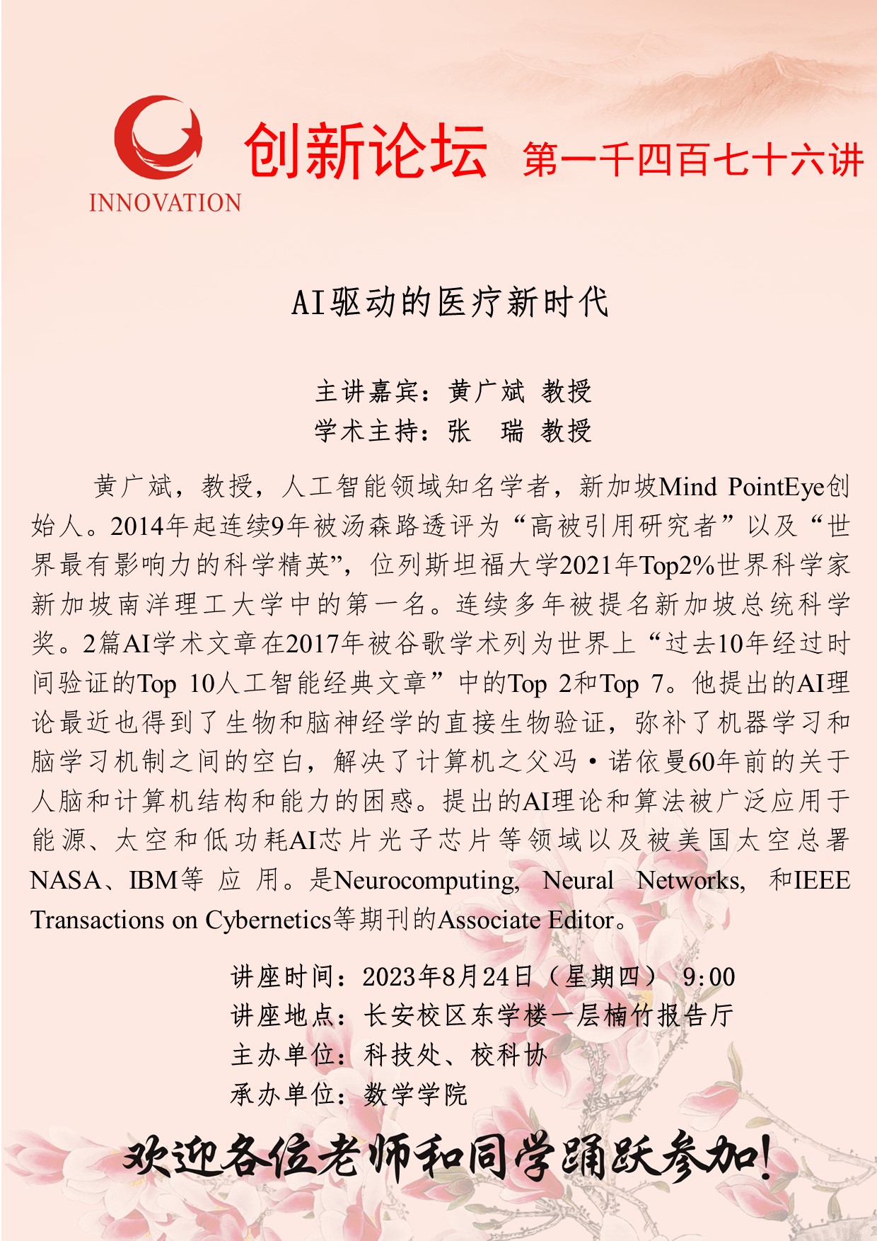 黄广斌 教授 伟德国际1949始于英国创新论坛第一千四百七十六讲:超限学习机和深度学习的汇聚: 智能科学体系统一性理论原理 讲座时间 2023年8月24日(星期四) 9:00 讲座地点 长安校区东学楼一层楠竹报告厅 讲座人介绍 黄广斌 教授 讲座内容