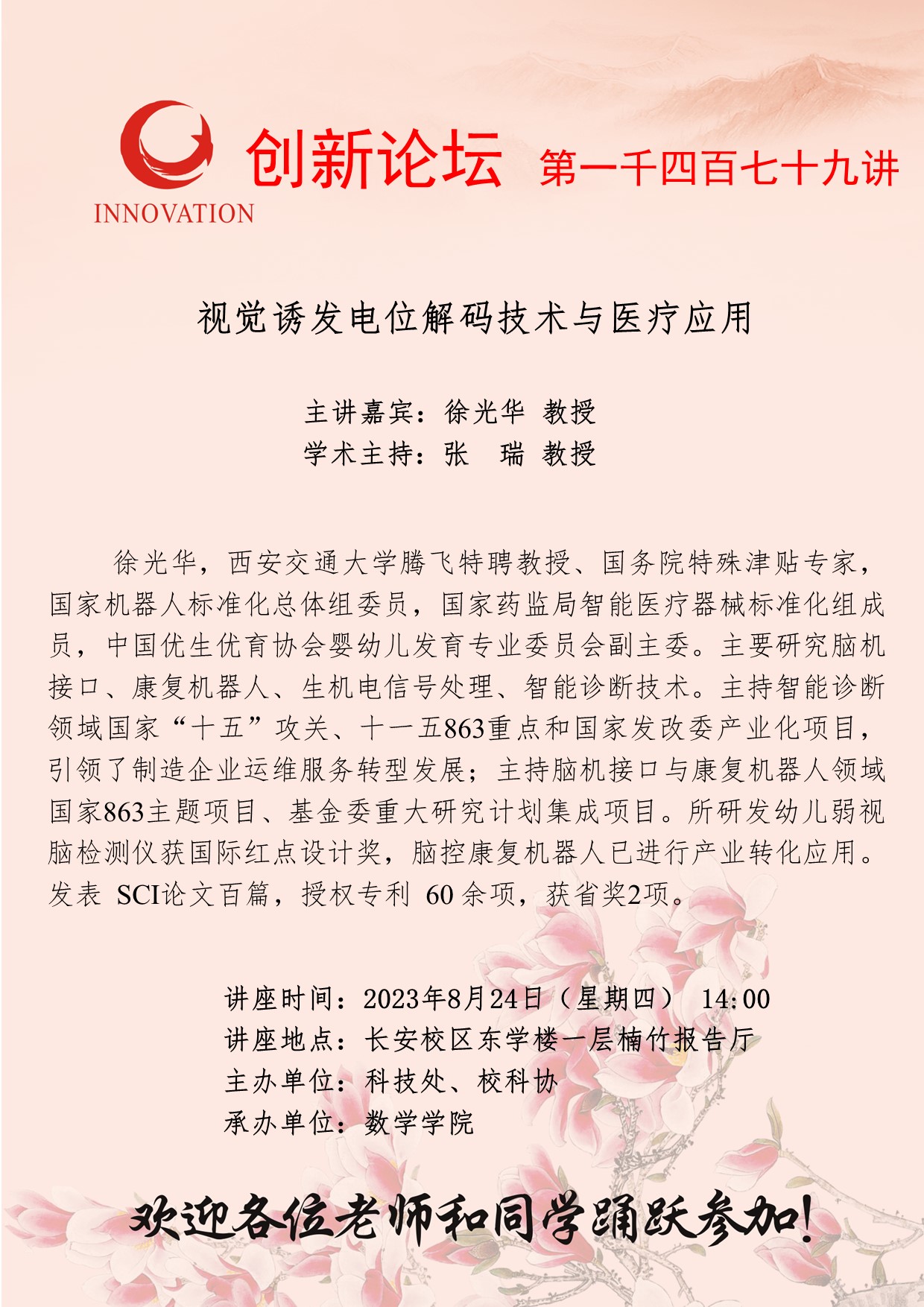 徐光华 教授 伟德国际1949始于英国创新论坛第一千四百七十九讲:视觉诱发电位解码技术与医疗应用 讲座时间 2023年8月24日(星期四) 14:00 讲座地点 长安校区东学楼一层楠竹报告厅 讲座人介绍 徐光华 教授 讲座内容