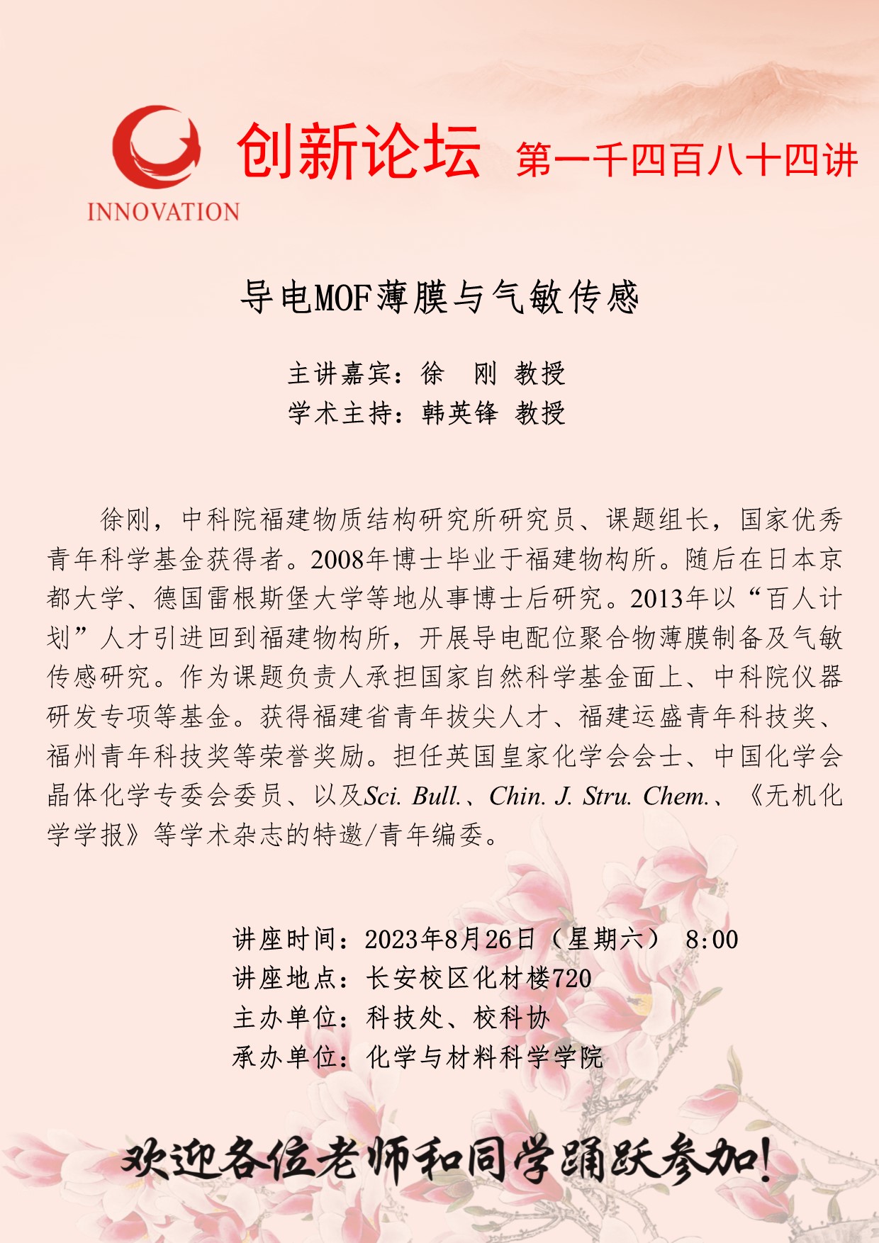 徐刚 教授 伟德国际1949始于英国创新论坛第一千四百八十四讲:导电MOF薄膜与气敏传感 讲座时间 2023年8月26日(星期六) 8:00 讲座地点 长安校区化材楼720 讲座人介绍 徐刚 教授 讲座内容