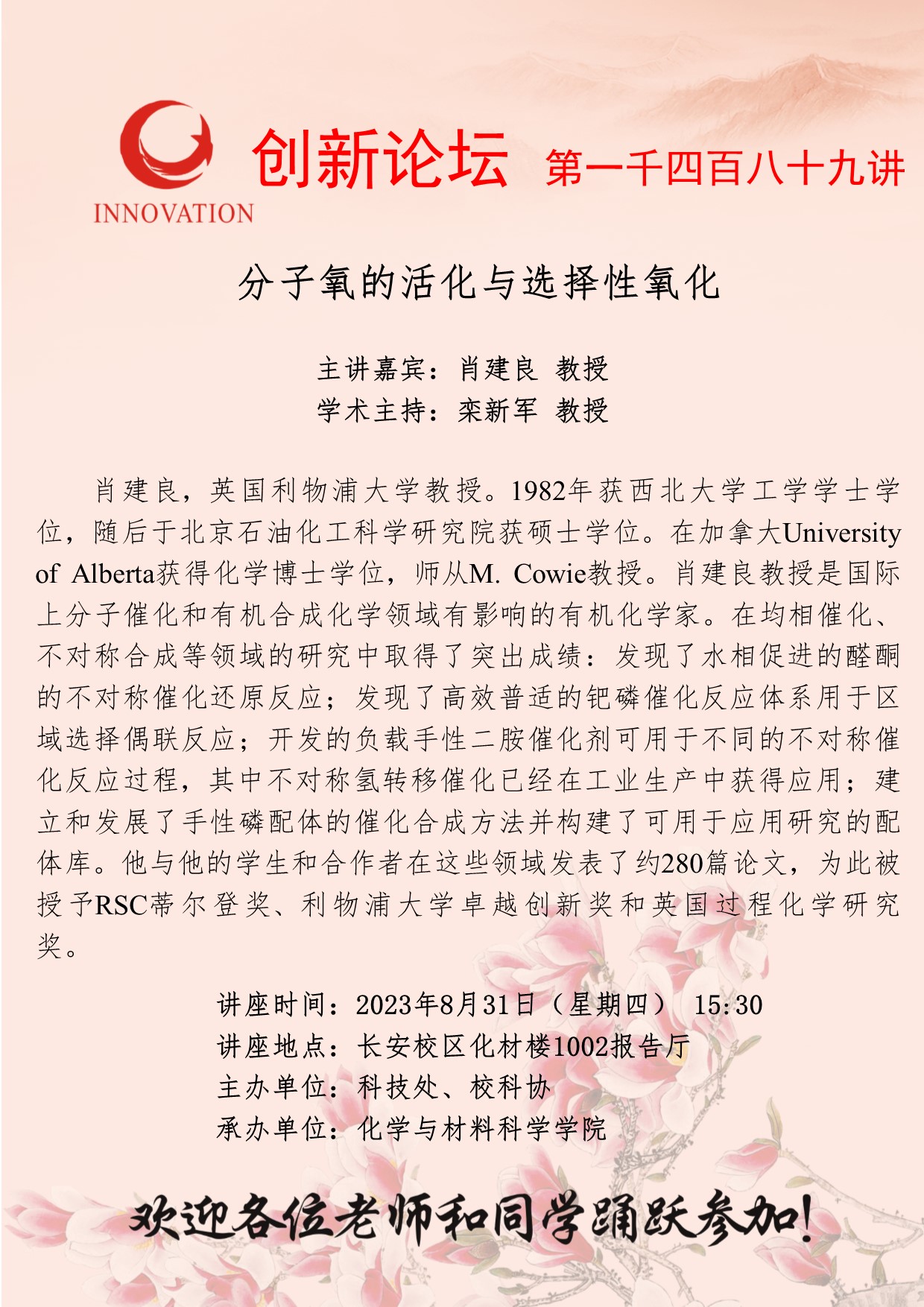 肖建良 教授 伟德国际1949始于英国创新论坛第一千四百八十九讲:分子氧的活化与选择性氧化 讲座时间 2023年8月31日(星期四) 15:30 讲座地点 长安校区化材楼1002报告厅 讲座人介绍 肖建良 教授 讲座内容
