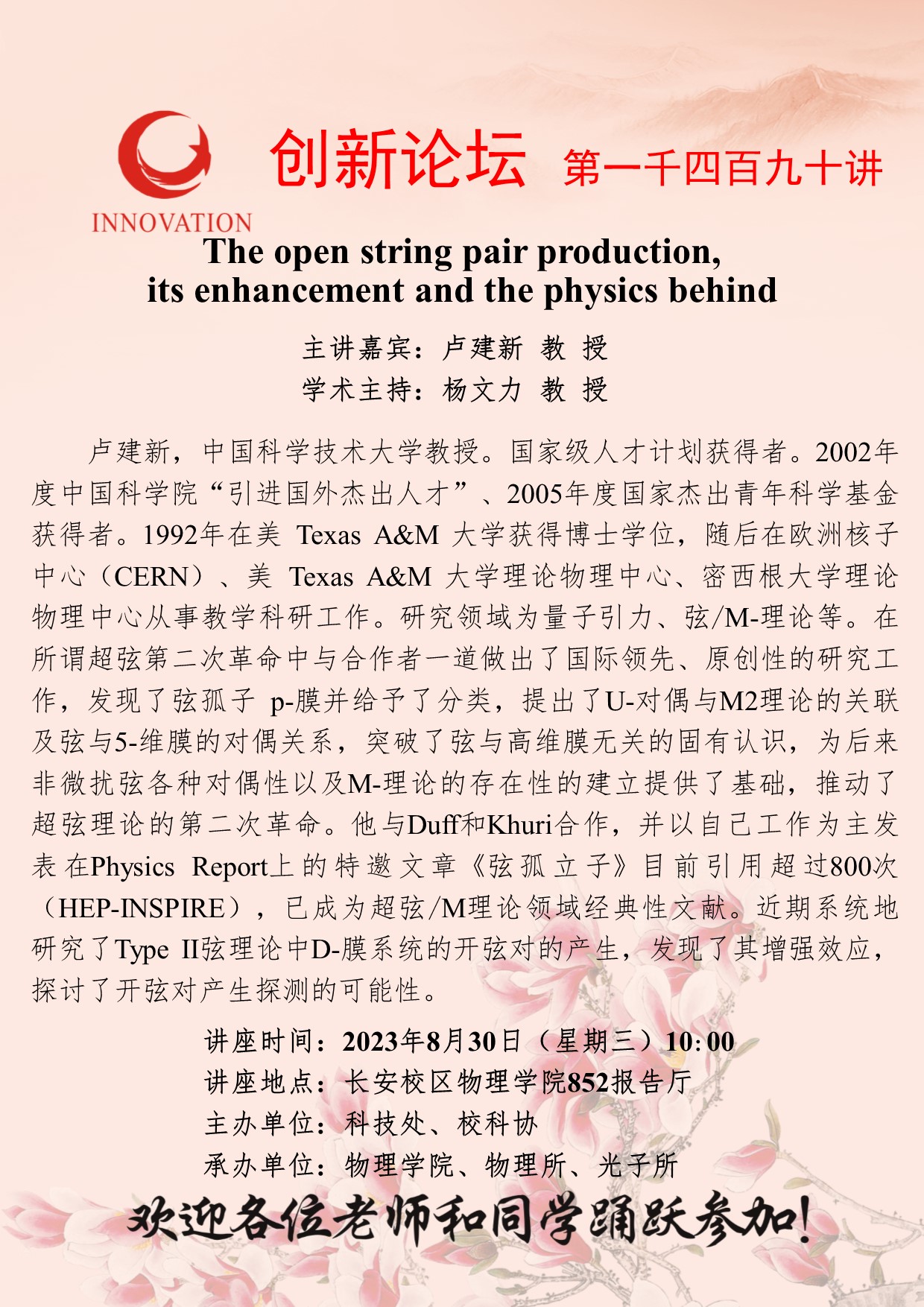 卢建新 教授 伟德国际1949始于英国创新论坛第一千四百九十讲:The open string pair production, its enhancement and the physics behind 讲座时间 2023年8月30日(星期三)10:00 讲座地点 长安校区物理学院852报告厅 讲座人介绍 卢建新 教授 讲座内容