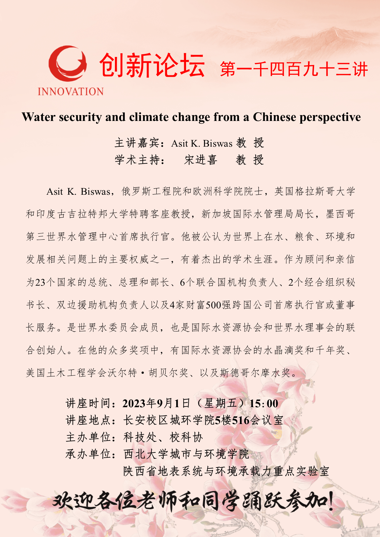 Asit K. Biswas 教授 伟德国际1949始于英国创新论坛第一千四百九十三讲:Water security and climate change from a Chinese perspective 讲座时间 2023年9月1日(星期五)15:00 讲座地点 长安校区城环学院5楼516会议室 讲座人介绍 Asit K. Biswas 教授 讲座内容