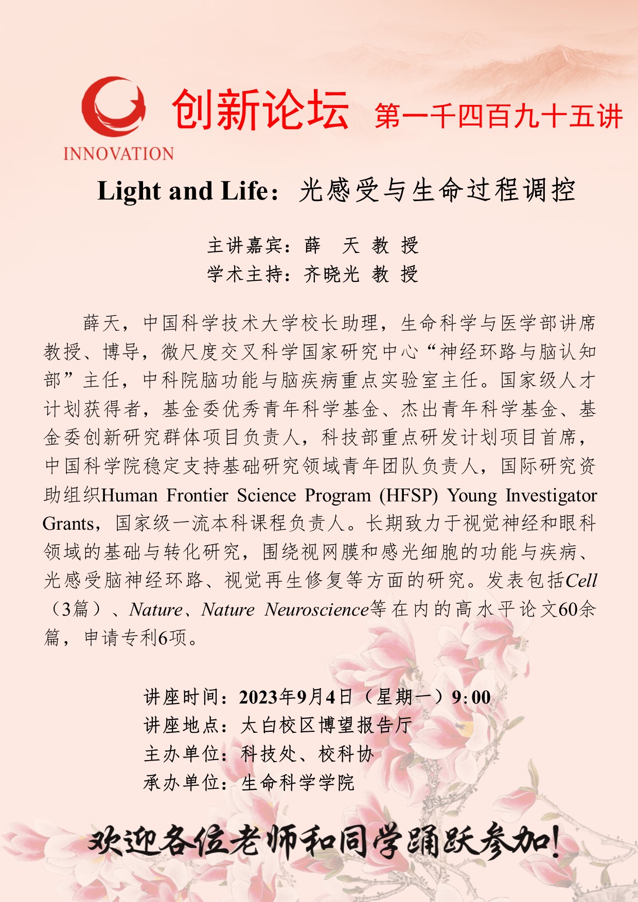 薛天 教授 伟德国际1949始于英国创新论坛第一千四百九十五讲:Light and Life:光感受与生命过程调控 讲座时间 2023年9月4日(星期一)9:00 讲座地点 太白校区博望报告厅 讲座人介绍 薛天 教授 讲座内容