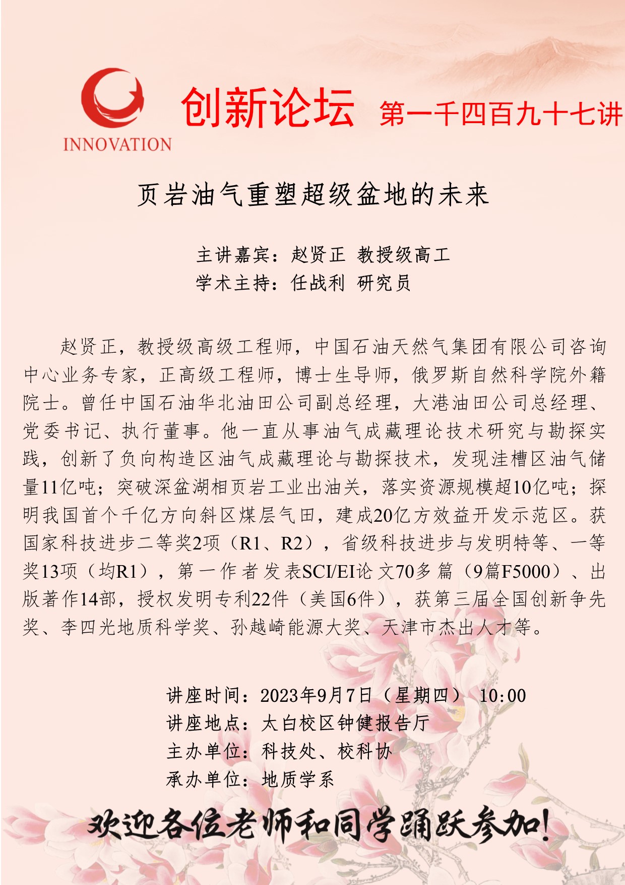 赵贤正 教授级高工 伟德国际1949始于英国创新论坛第一千四百九十七讲:页岩油气重塑超级盆地的未来 讲座时间 2023年9月7日(星期四) 10:00 讲座地点 太白校区钟健报告厅 讲座人介绍 赵贤正 教授级高工 讲座内容