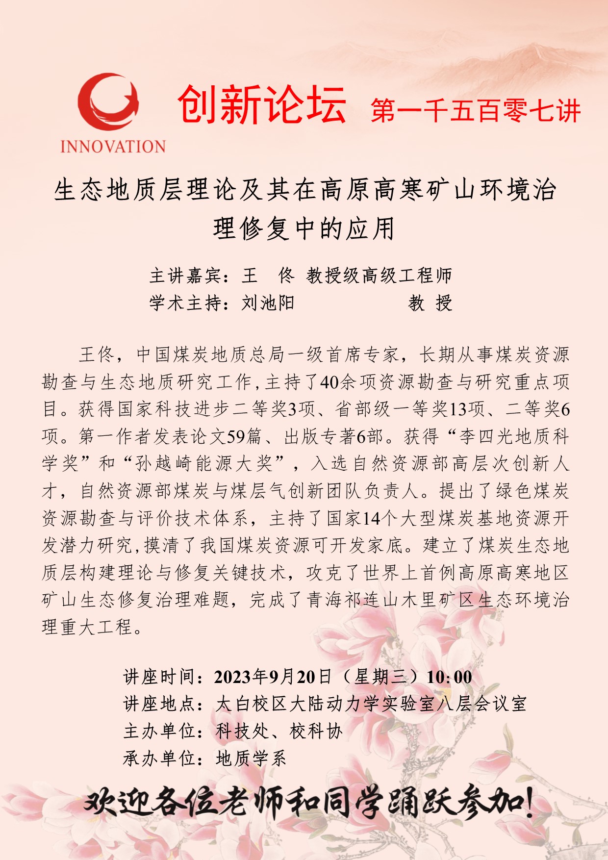 王佟 教授级高级工程师 伟德国际1949始于英国创新论坛第一千五百零七讲:生态地质层理论及其在高原高寒矿山环境治理修复中的应用 讲座时间 2023年9月20日(星期三)10:00 讲座地点 太白校区大陆动力学实验室八层会议室 讲座人介绍 王佟 教授级高级工程师 讲座内容