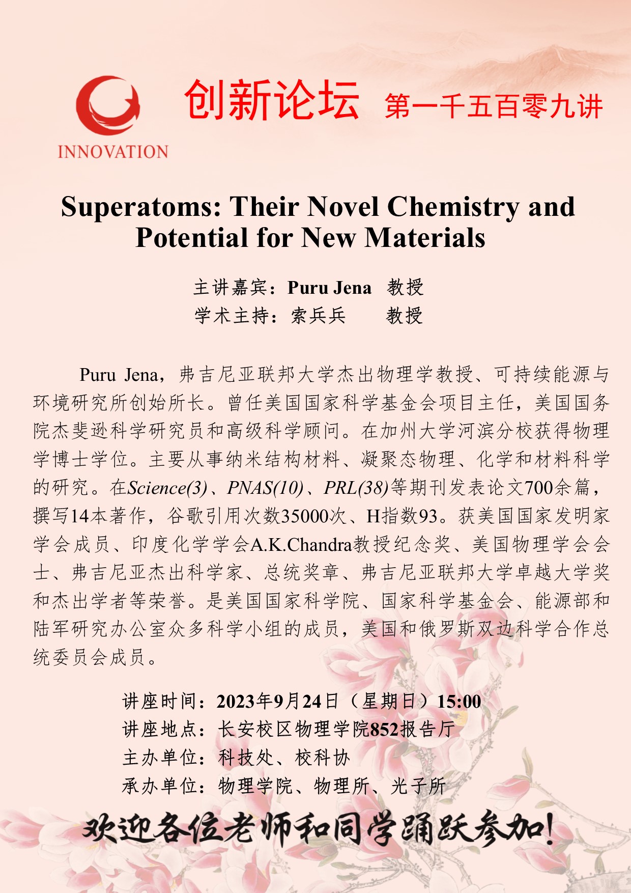 Puru Jena 教授 伟德国际1949始于英国创新论坛第一千五百零九讲:Superatoms: Their Novel Chemistry and Potential for New Materials 讲座时间 2023年9月24日(星期日)15:00 讲座地点 长安校区物理学院852报告厅 讲座人介绍 Puru Jena 教授 讲座内容