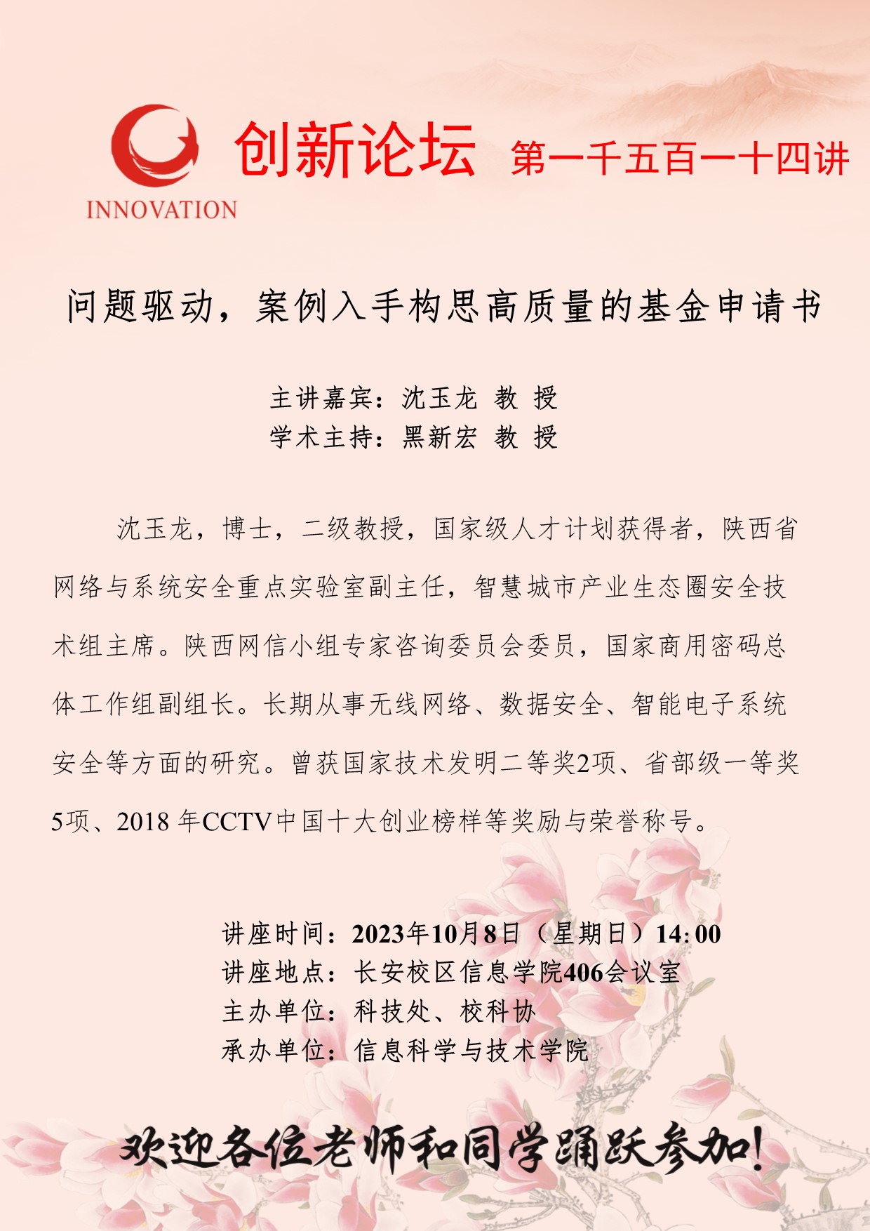 沈玉龙 教 授 伟德国际1949始于英国创新论坛第一千五百一十四讲: 问题驱动,案例入手构思高质量的基金申请书 讲座时间 2023年10月8日(星期日)14:00 讲座地点 长安校区信息学院406会议室 讲座人介绍 沈玉龙 教 授 讲座内容