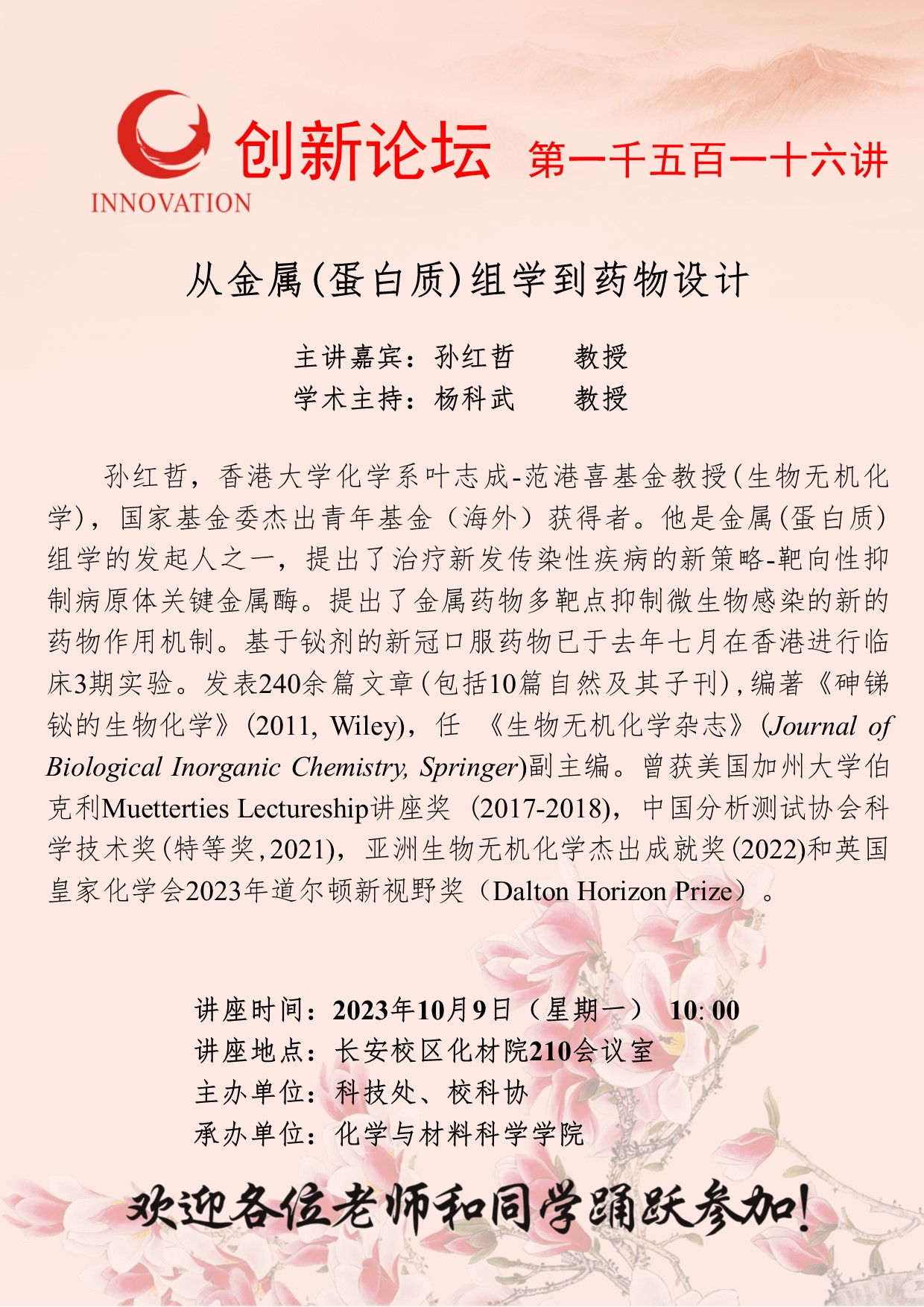 孙红哲 教授 伟德国际1949始于英国创新论坛第一千五百一十六讲:从金属(蛋白质)组学到药物设计 讲座时间 2023年10月9日(星期一) 10: 00 讲座地点 长安校区化材院210会议室 讲座人介绍 孙红哲 教授 讲座内容