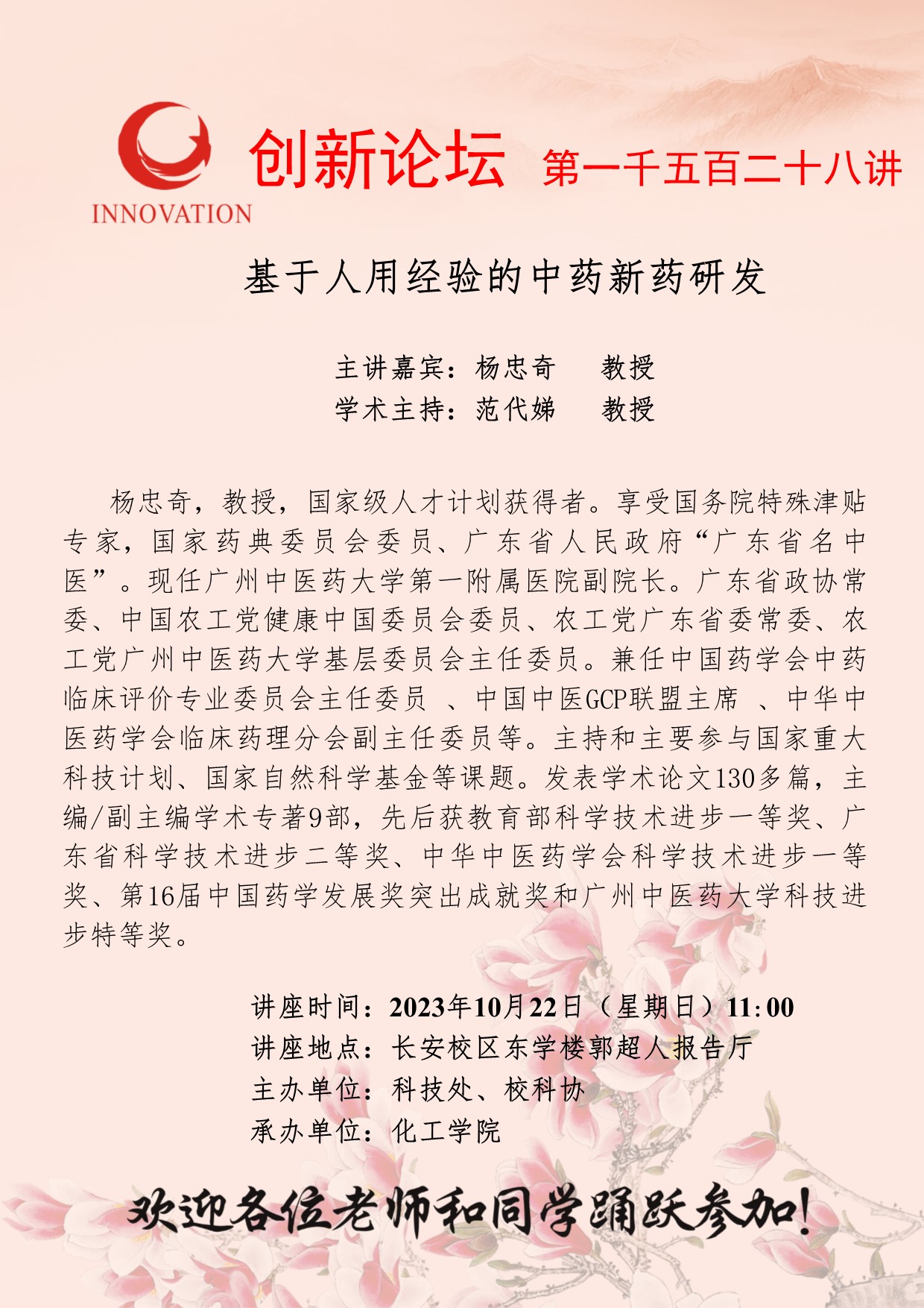 杨忠奇 教授 伟德国际1949始于英国创新论坛第一千五百二十八讲:基于人用经验的中药新药研发 讲座时间 2023年10月22日(星期日)11:00 讲座地点 长安校区东学楼郭超人报告厅 讲座人介绍 杨忠奇 教授 讲座内容