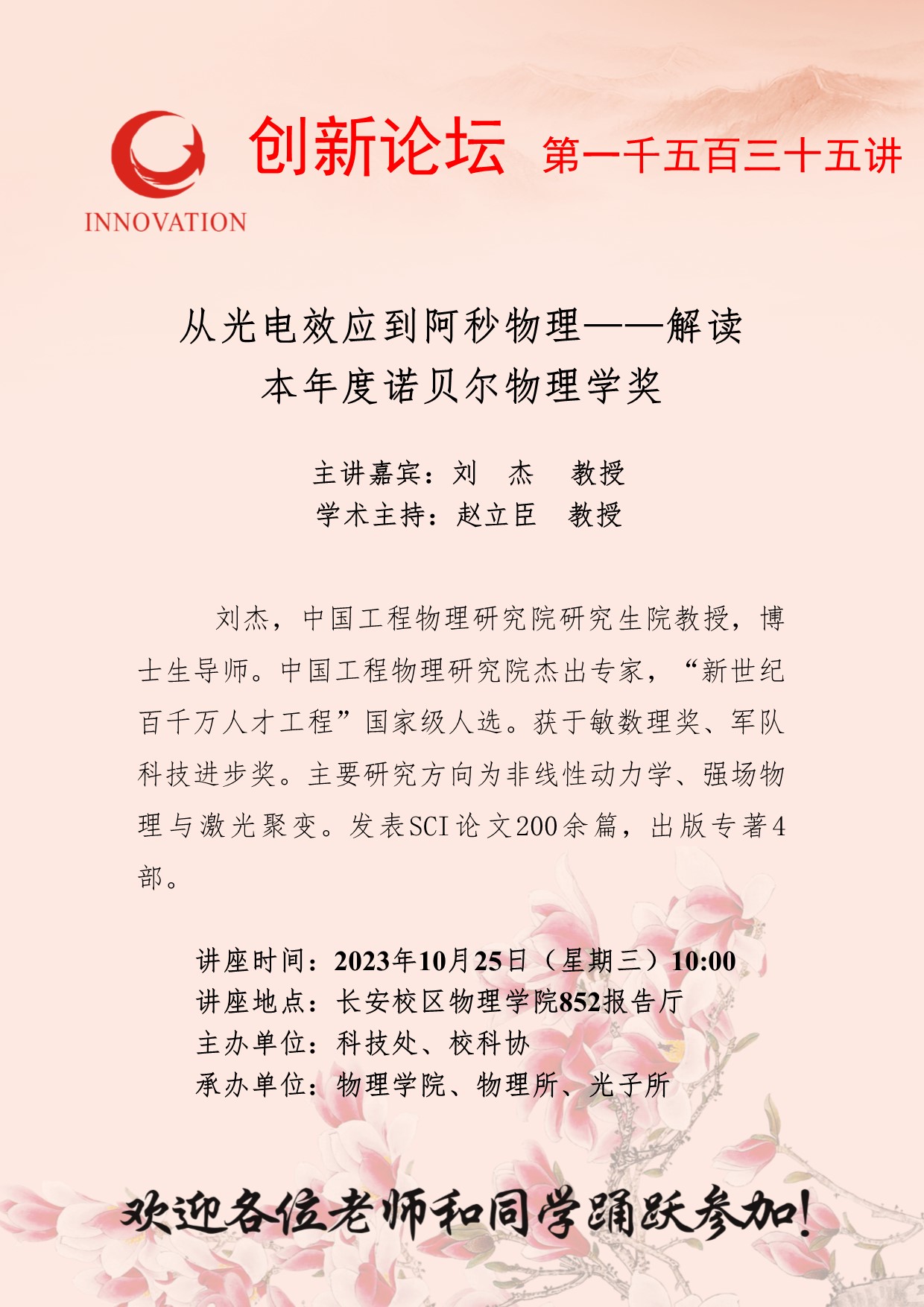 刘 杰 教授 伟德国际1949始于英国创新论坛第一千五百三十五讲:从光电效应到阿秒物理——解读 本年度诺贝尔物理学奖 讲座时间 2023年10月25日(星期三)10:00 讲座地点 长安校区物理学院852报告厅 讲座人介绍 刘 杰 教授 讲座内容