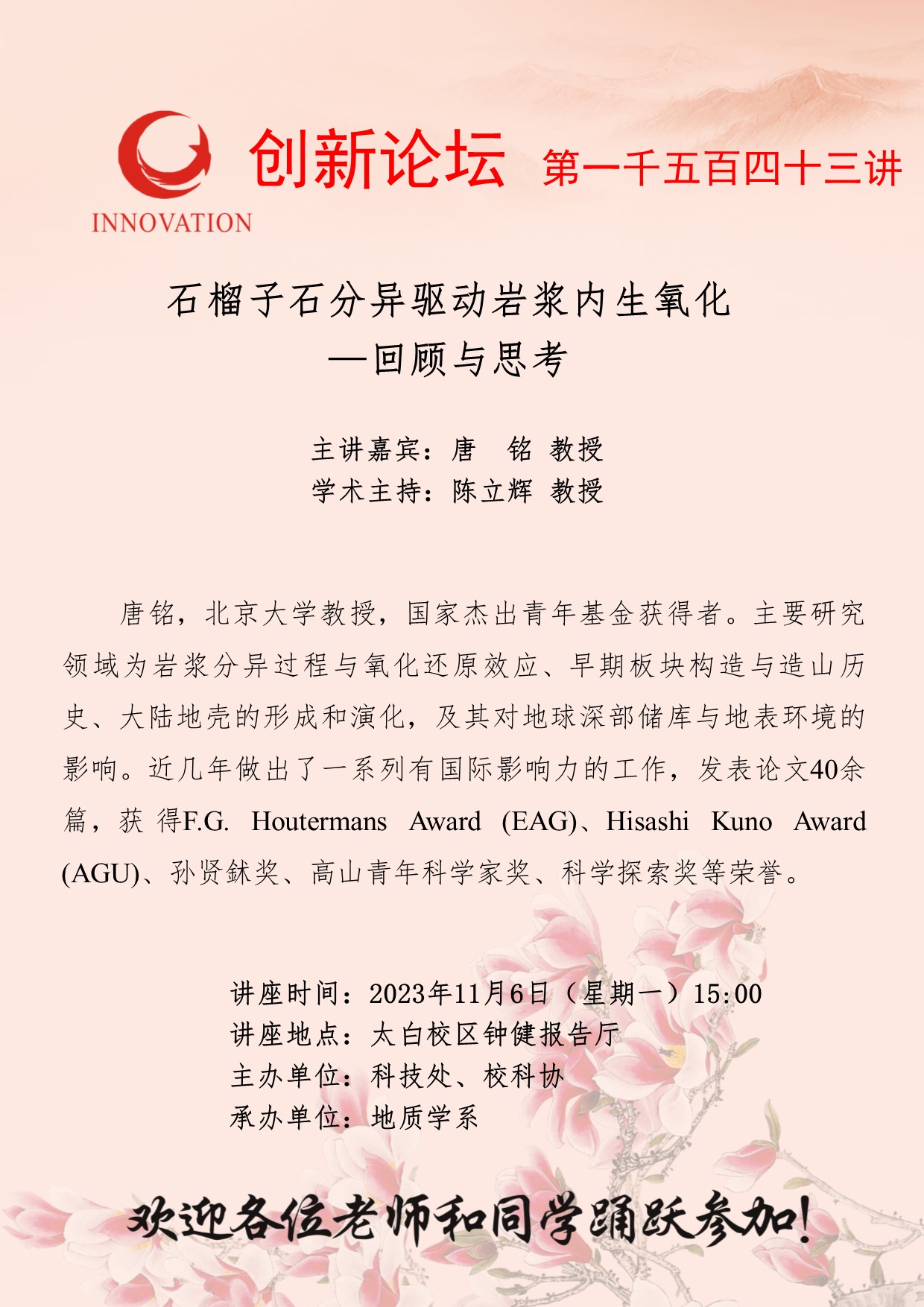 唐铭 教授 伟德国际1949始于英国创新论坛第一千五百四十三讲:石榴子石分异驱动岩浆内生氧化—回顾与思考 讲座时间 2023年11月6日(星期一)15:00 讲座地点 太白校区钟健报告厅 讲座人介绍 唐铭 教授 讲座内容