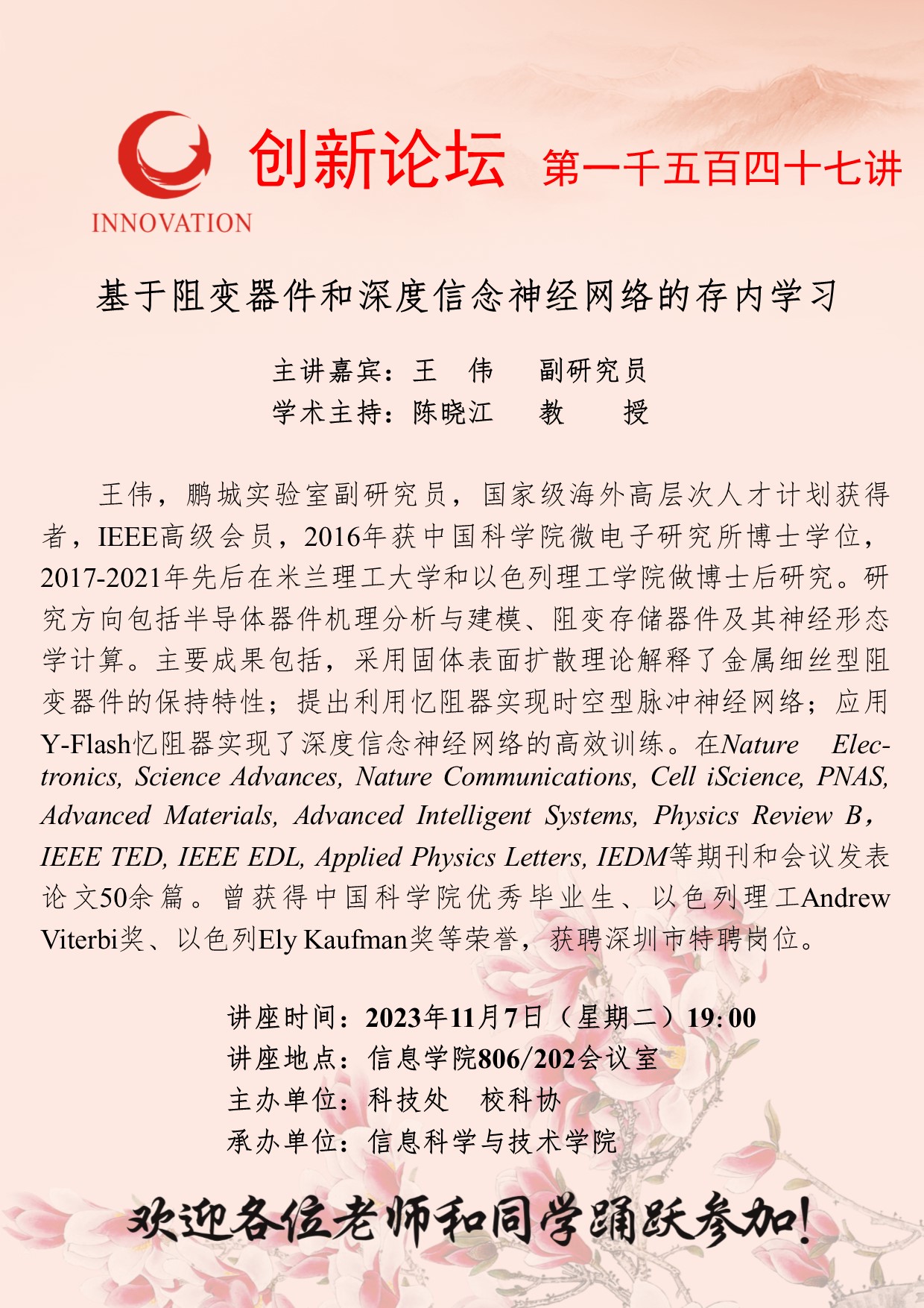 王 伟 副研究员 伟德国际1949始于英国创新论坛第一千五百四十七讲:基于阻变器件和深度信念神经网络的存内学习 讲座时间 2023年11月7日(星期二)19:00 讲座地点 信息学院806/202会议室 讲座人介绍 王 伟 副研究员 讲座内容