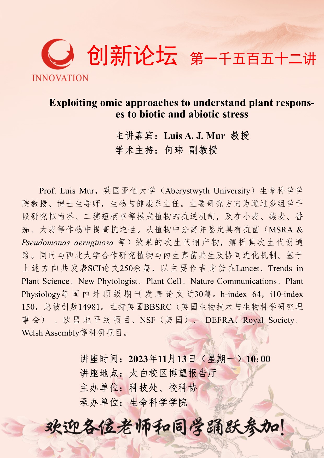 Luis A. J. Mur 教授 伟德国际1949始于英国创新论坛第一千五百五十二讲:Exploiting omic approaches to understand plant responses to biotic and abiotic stress 讲座时间 2023年11月13日(星期一)10:00 讲座地点 太白校区博望报告厅 讲座人介绍 Luis A. J. Mur 教授 讲座内容