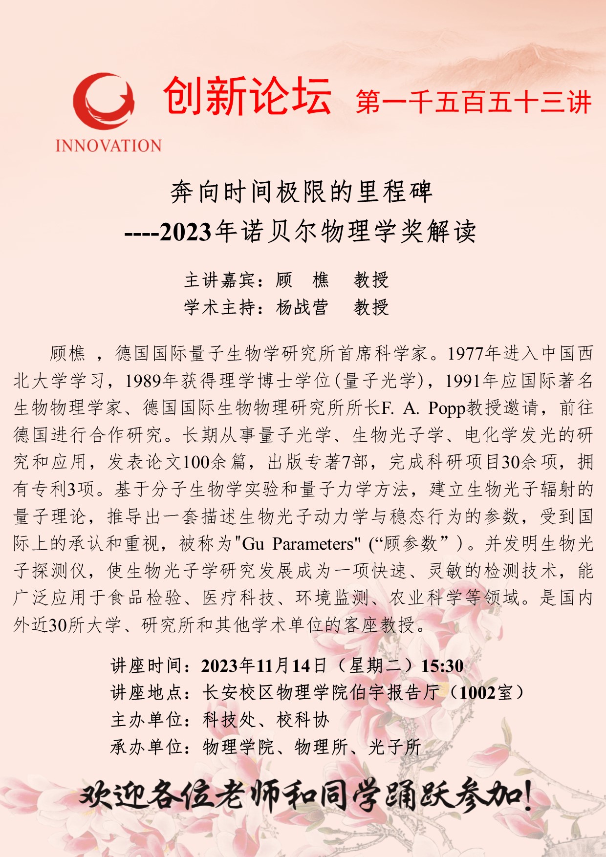 顾樵 教授 伟德国际1949始于英国创新论坛第一千五百五十三讲:奔向时间极限的里程碑----2023年诺贝尔物理学奖解读 讲座时间 2023年11月14日(星期二)15:30 讲座地点 长安校区物理学院伯宇报告厅(1002室) 讲座人介绍 顾樵 教授 讲座内容