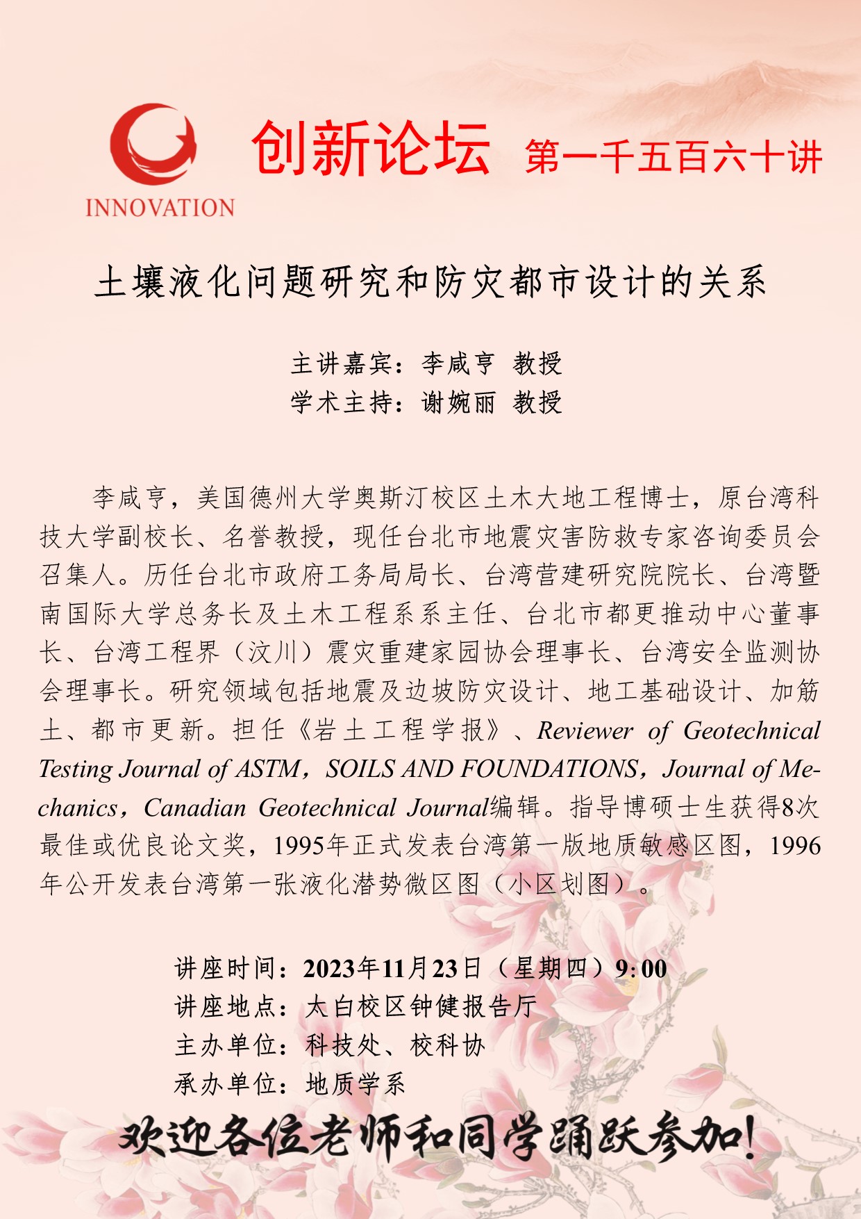 李咸亨 教授 伟德国际1949始于英国创新论坛第一千五百六十讲:土壤液化问题研究和防灾都市设计的关系 讲座时间 2023年11月23日(星期四)9:00 讲座地点 太白校区钟健报告厅 讲座人介绍 李咸亨 教授 讲座内容