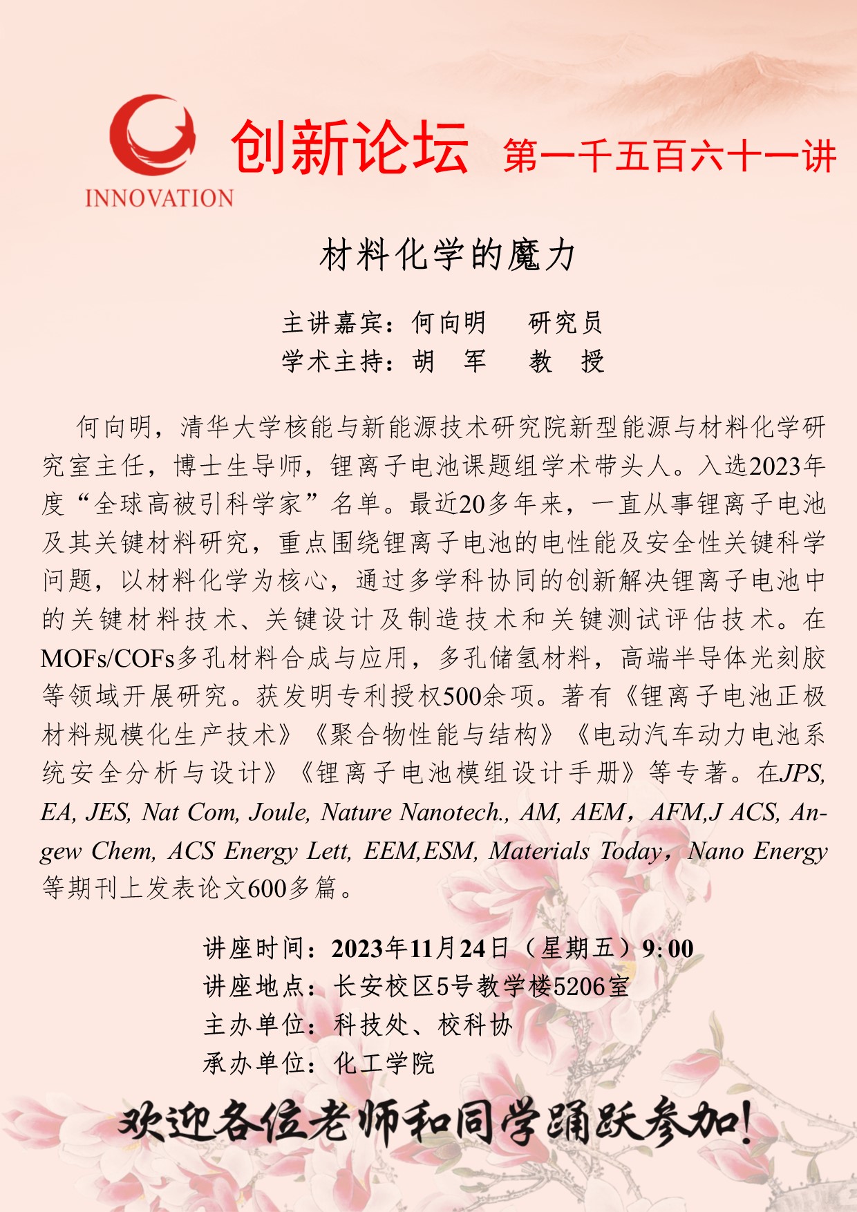 何向明 研究员 伟德国际1949始于英国创新论坛第一千五百六十一讲:材料化学的魔力 讲座时间 2023年11月24日(星期五)9:00 讲座地点 长安校区5号教学楼5206室 讲座人介绍 何向明 研究员 讲座内容