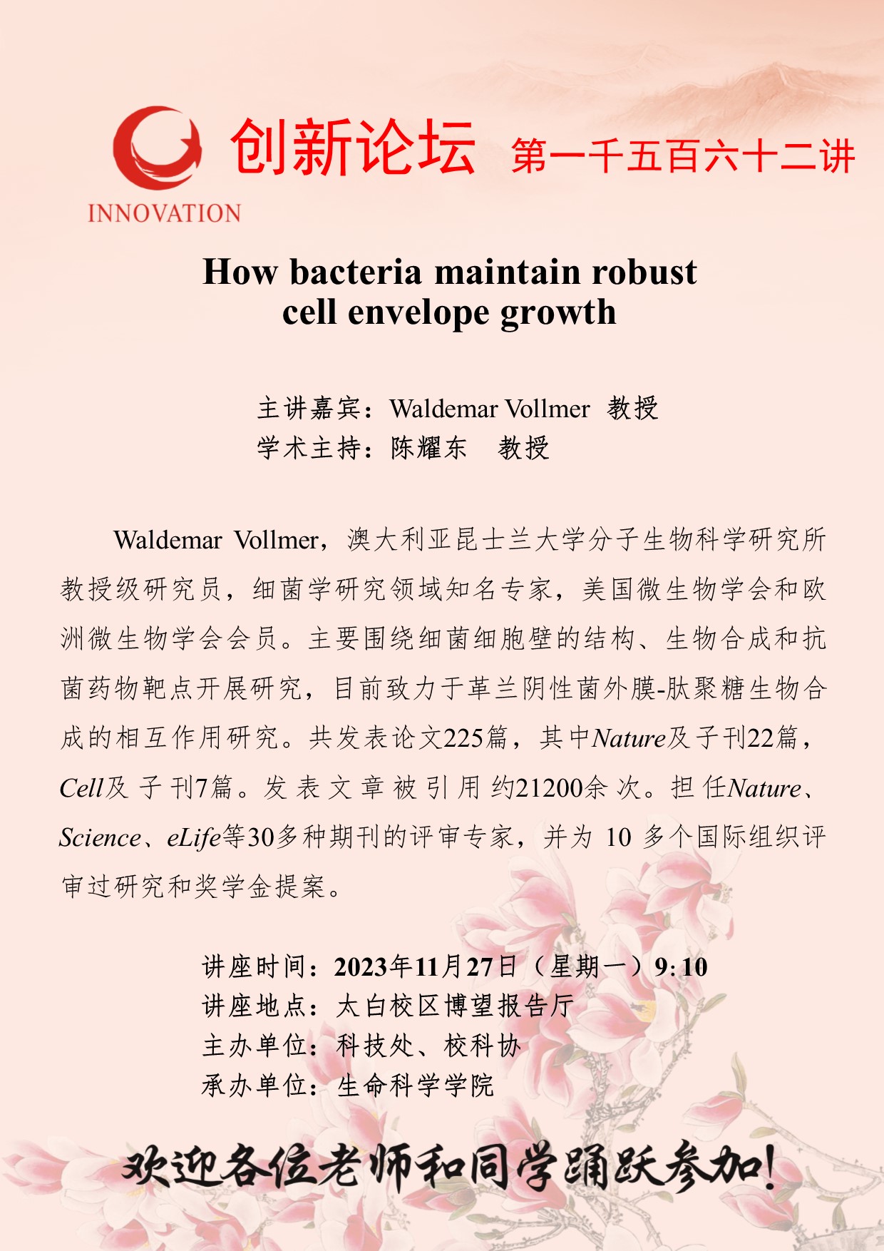 Waldemar Vollmer 教授 伟德国际1949始于英国创新论坛第一千五百六十二讲:How bacteria maintain robust cell envelope growth 讲座时间 2023年11月27日(星期一)9:10 讲座地点 太白校区博望报告厅 讲座人介绍 Waldemar Vollmer 教授 讲座内容