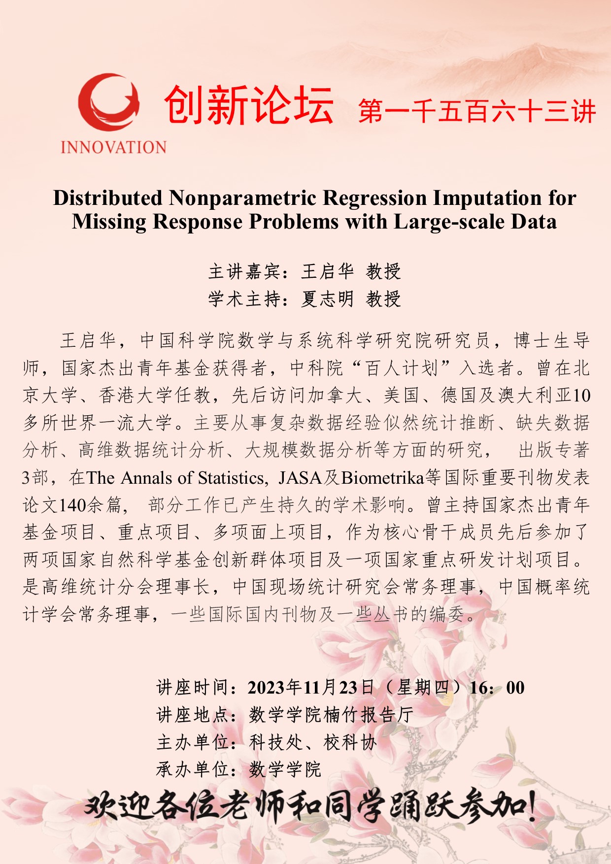 王启华 教授 伟德国际1949始于英国创新论坛第一千五百六十三讲:Distributed Nonparametric Regression Imputation for Missing Response Problems with Large-scale Data 讲座时间 2023年11月23日(周四)16:00 讲座地点 数学学院楠竹报告厅 讲座人介绍 王启华 教授 讲座内容