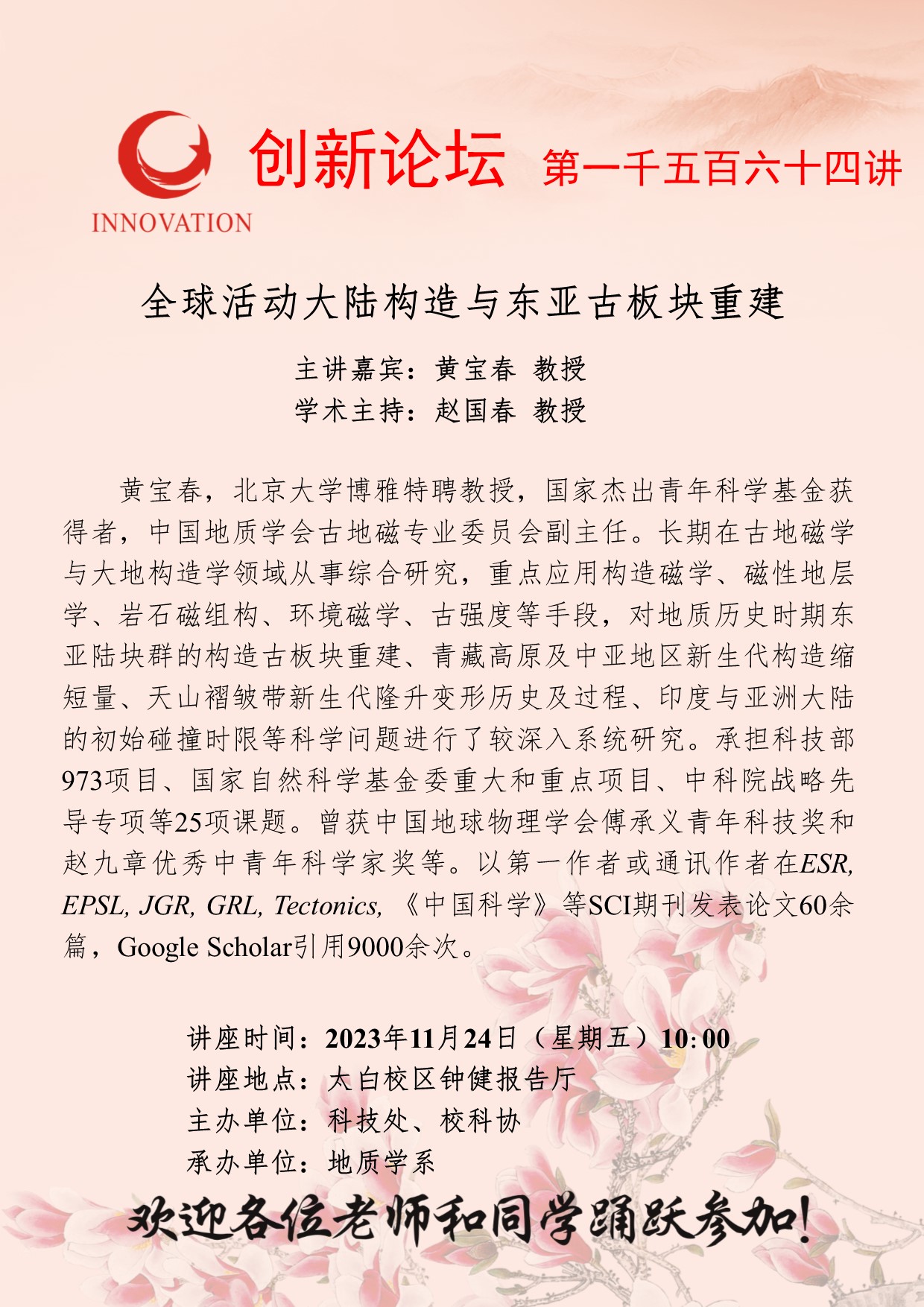 黄宝春 教授 伟德国际1949始于英国创新论坛第一千五百六十四讲:全球活动大陆构造与东亚古板块重建 讲座时间 2023年11月24日(星期五)10:00 讲座地点 太白校区钟健报告厅 讲座人介绍 黄宝春 教授 讲座内容