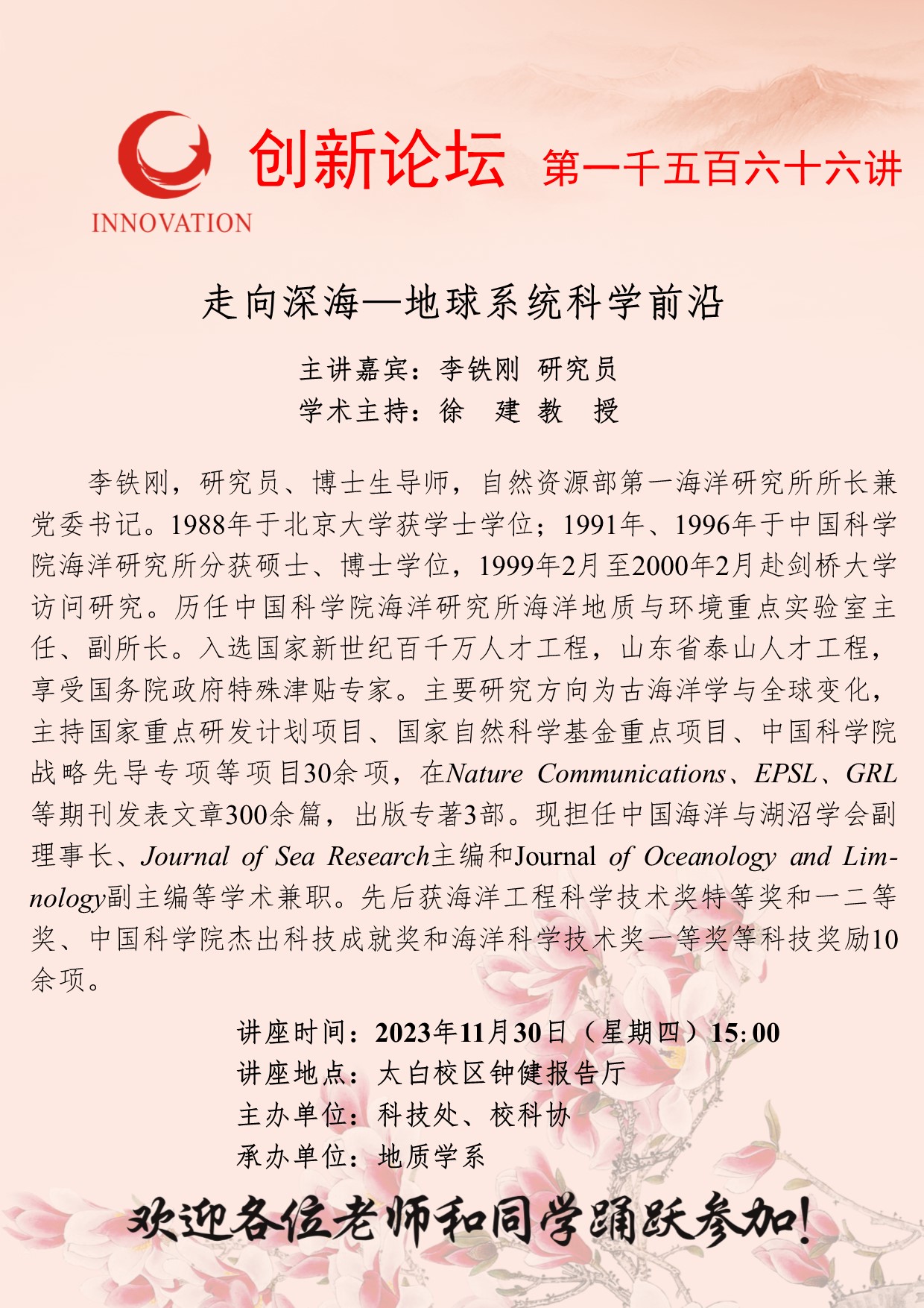 李铁刚 研究员 伟德国际1949始于英国创新论坛第一千五百六十六讲:走向深海—地球系统科学前沿 讲座时间 2023年11月30日(星期四)15:00 讲座地点 太白校区钟健报告厅 讲座人介绍 李铁刚 研究员 讲座内容